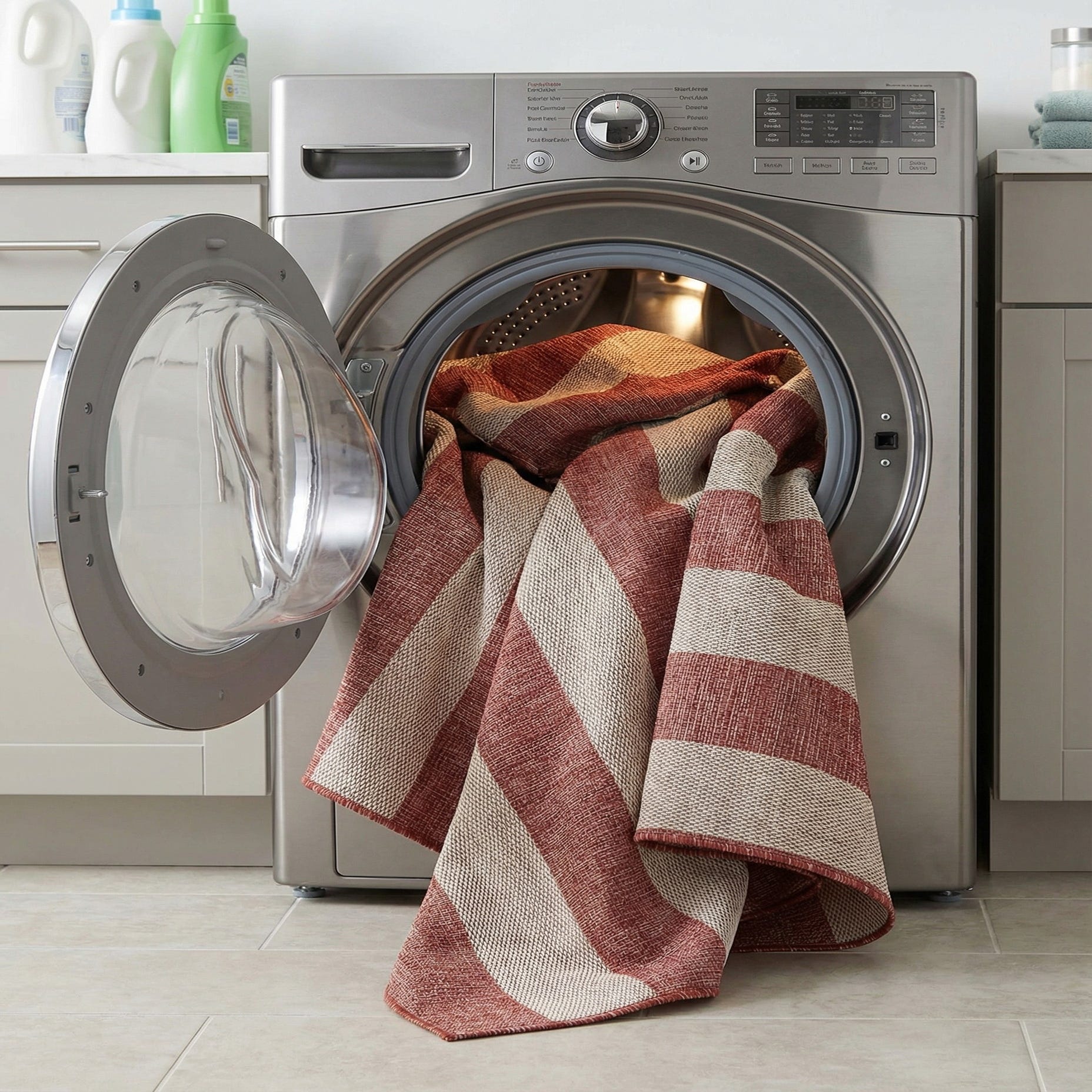 The Outdoor Ribbon collection presents a 6 Ft Square rug that offers a harmonious blend of functionality and style. Machine-woven of 100% polypropylene, this rug showcases a crisp striped pattern alternating between a robust rust red and a versatile gray, set on a rust red background that anchors the design.
