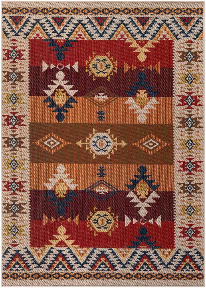 This rug fits well in a covered patio or sunroom, layered beneath rattan seating and teak furniture, and also translates easily to a rustic or Southwestern-inspired living room with leather and raw wood accents. Pair it with linen or navy upholstery, woven baskets and warm metallics for a cohesive look, or use it to bring color and pattern to an entryway, casual dining area, or balcony.