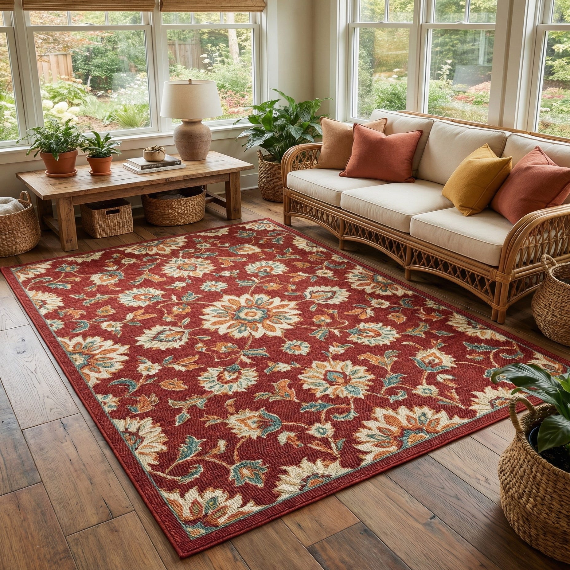 A 6x9 rectangular indoor/outdoor rug with a vibrant red background and a dense floral pattern featuring large orange, cream, and teal flowers with green leaves.