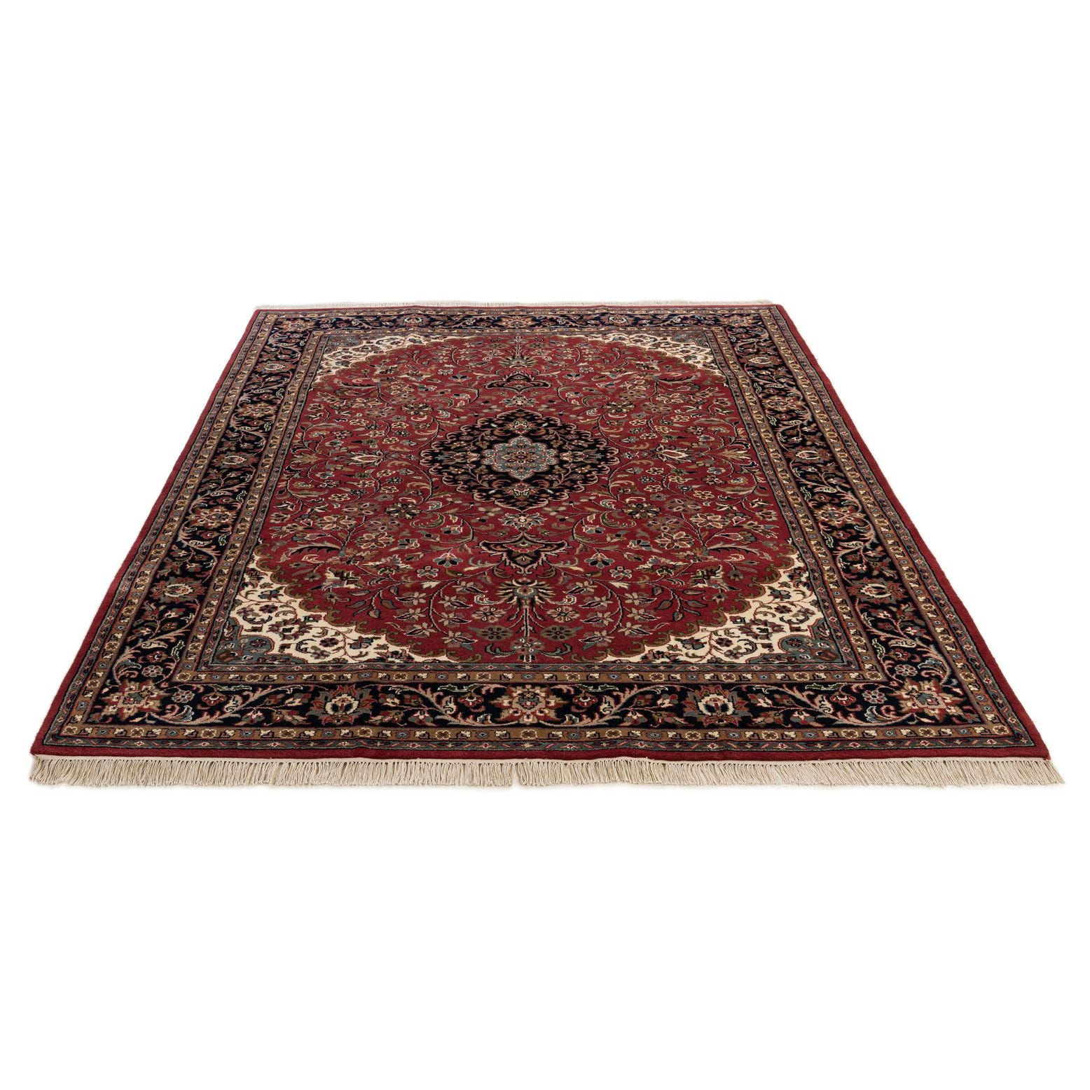 A classic Persian medallion anchors a rust red field, surrounded by scrolling vines and small floral motifs in ivory, beige, blue, navy blue, olive, gray, green and brown. The central navy-and-blue medallion and the ivory scalloped corner spandrels create focused contrast, while the navy floral border frames the composition and unifies the varied hues for a balanced, traditional look.