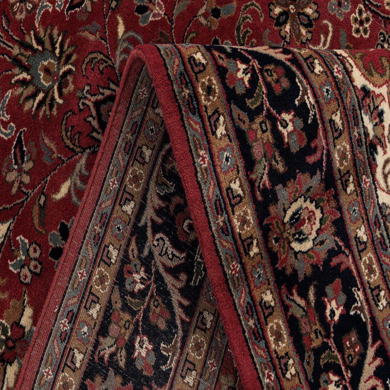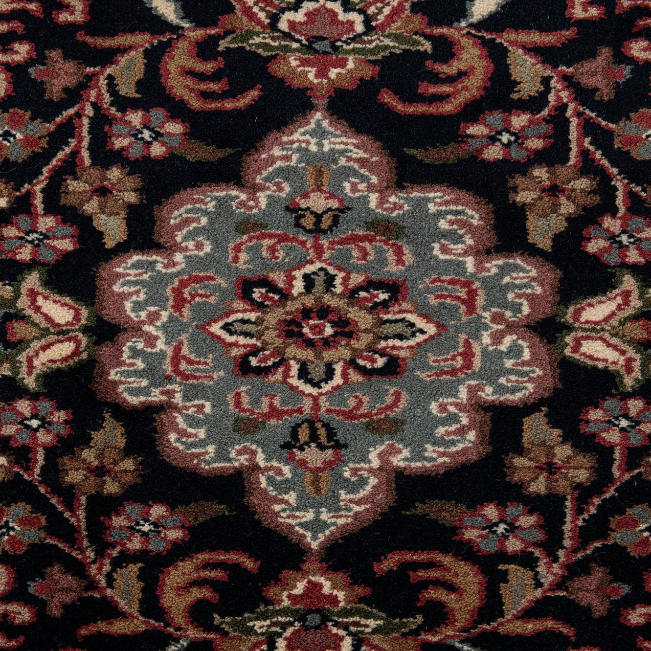 This rug pairs well with warm wood floors and leather or upholstered seating in a formal living room or study, and it can also ground a dining area with vintage or dark-stained furnishings. In a more modern setting it will add layered texture and pattern when placed beneath streamlined sofas or a simple wood coffee table; coordinate with navy or olive accents and brass or dark iron finishes for a cohesive scheme.