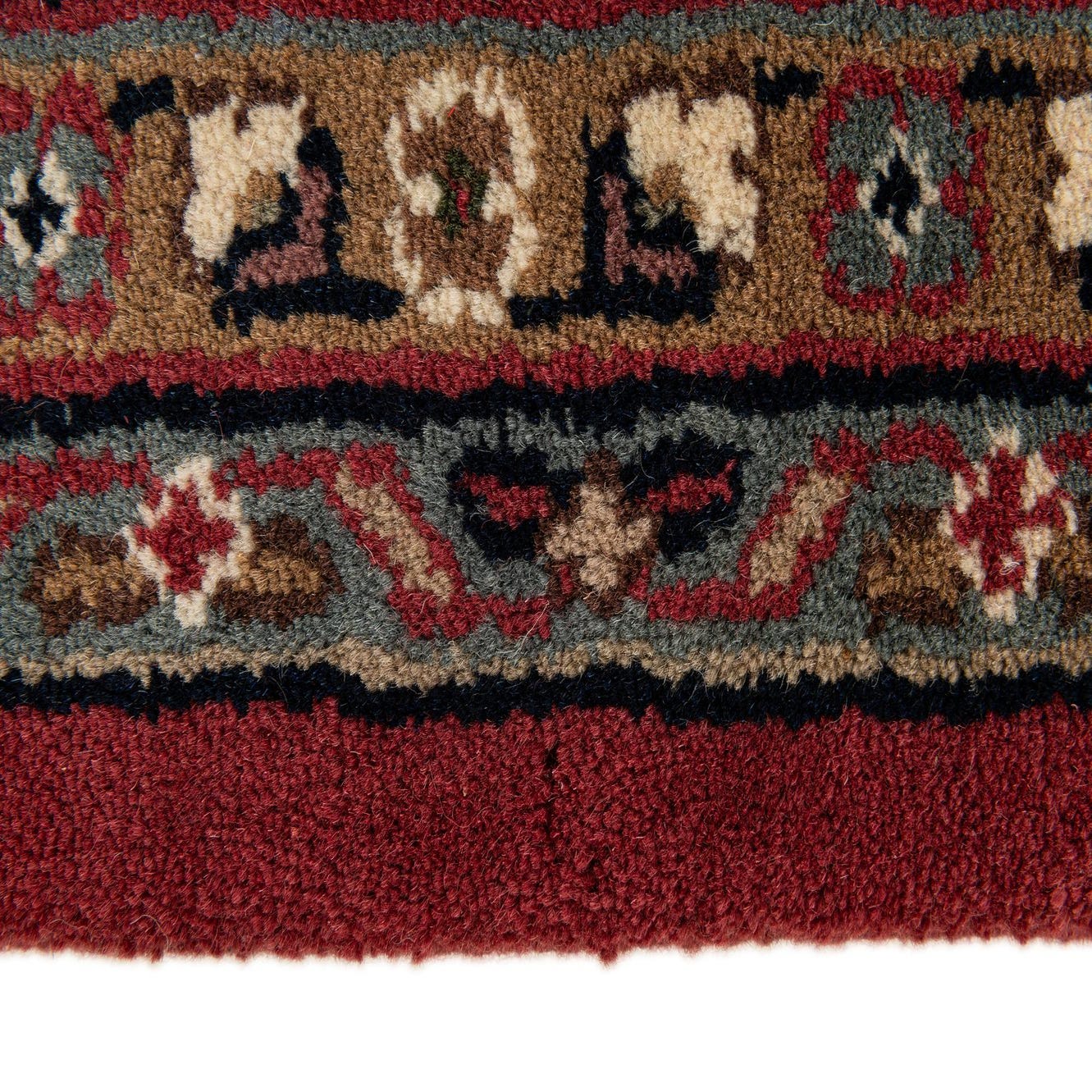 Primary color is Rust Red. Colors in this rug include: Rust Red, Beige, Blue, Brown, Ivory, Navy Blue, Olive, Gray, Green.