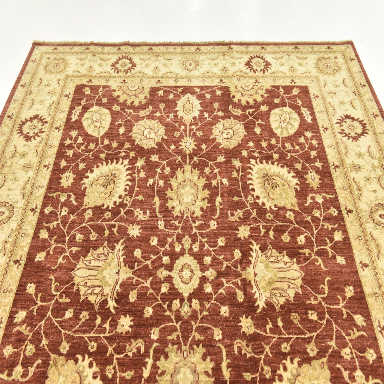 A 6x9 rectangular Peshawar Ziegler rug with a deep red field and intricate cream botanical and floral patterns, framed by a wide cream border with complementary designs.