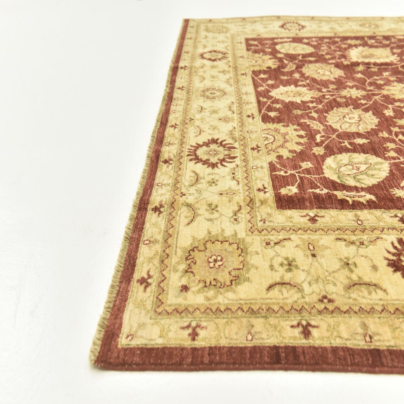 The texture is owed to the 100% hand-spun wool construction, offering both durability and a soft underfoot feel. The presence of fringes adds a touch of classic elegance, enhancing the overall antique-inspired look of this rug.
