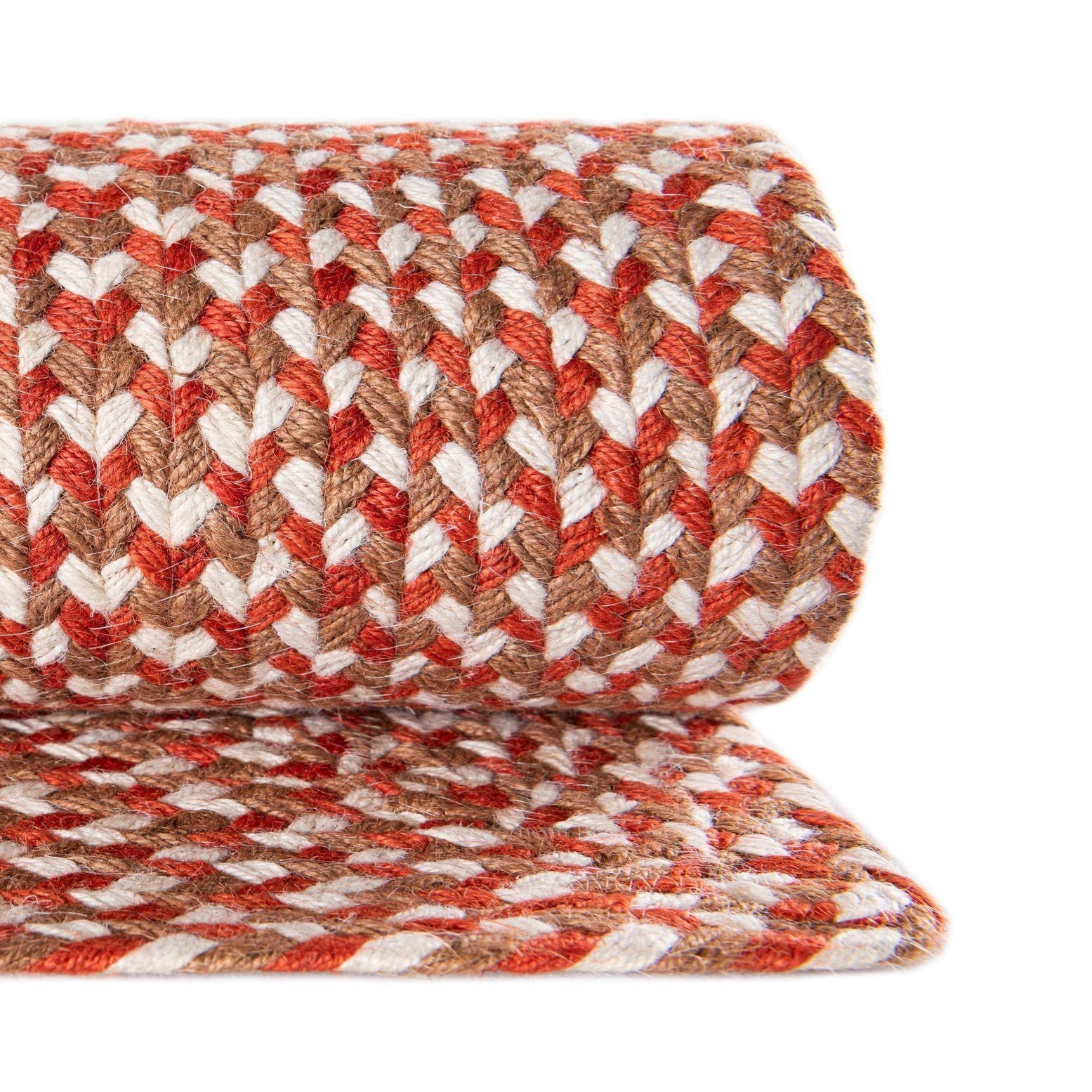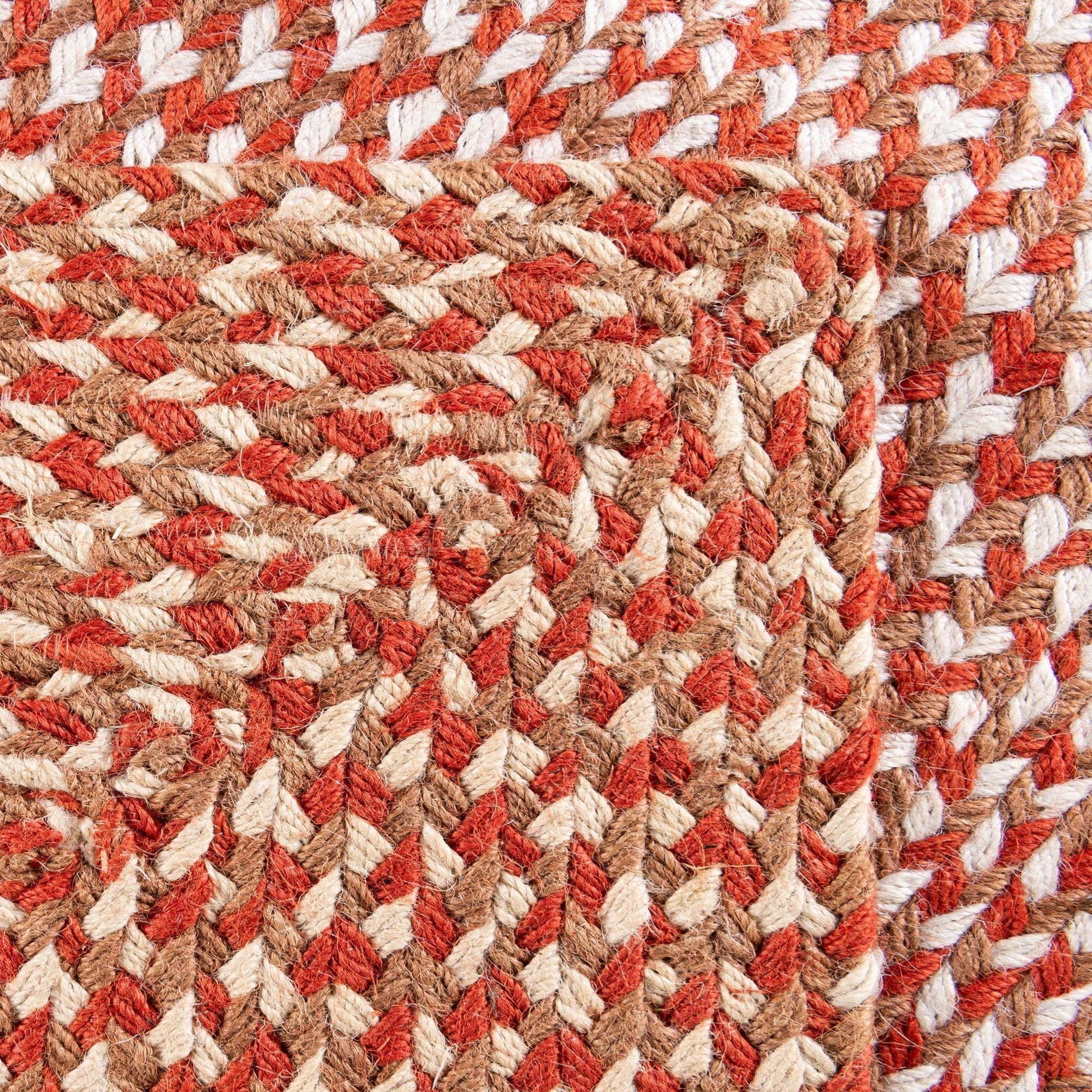 Warm rust red forms the backdrop for a tightly braided, tweed-like pattern woven with ivory and light brown fibers. The hand-braided construction creates a subtle directional texture where the braids meet, producing a defined bordered field and a layered visual depth. Running your hand over the surface reveals the natural grain of jute: a firm, slightly coarse texture with a low, dense profile and a matte, organic finish. Hand braided from 100% jute, the weave highlights the material’s natural variations and color interplay rather than printed detail.