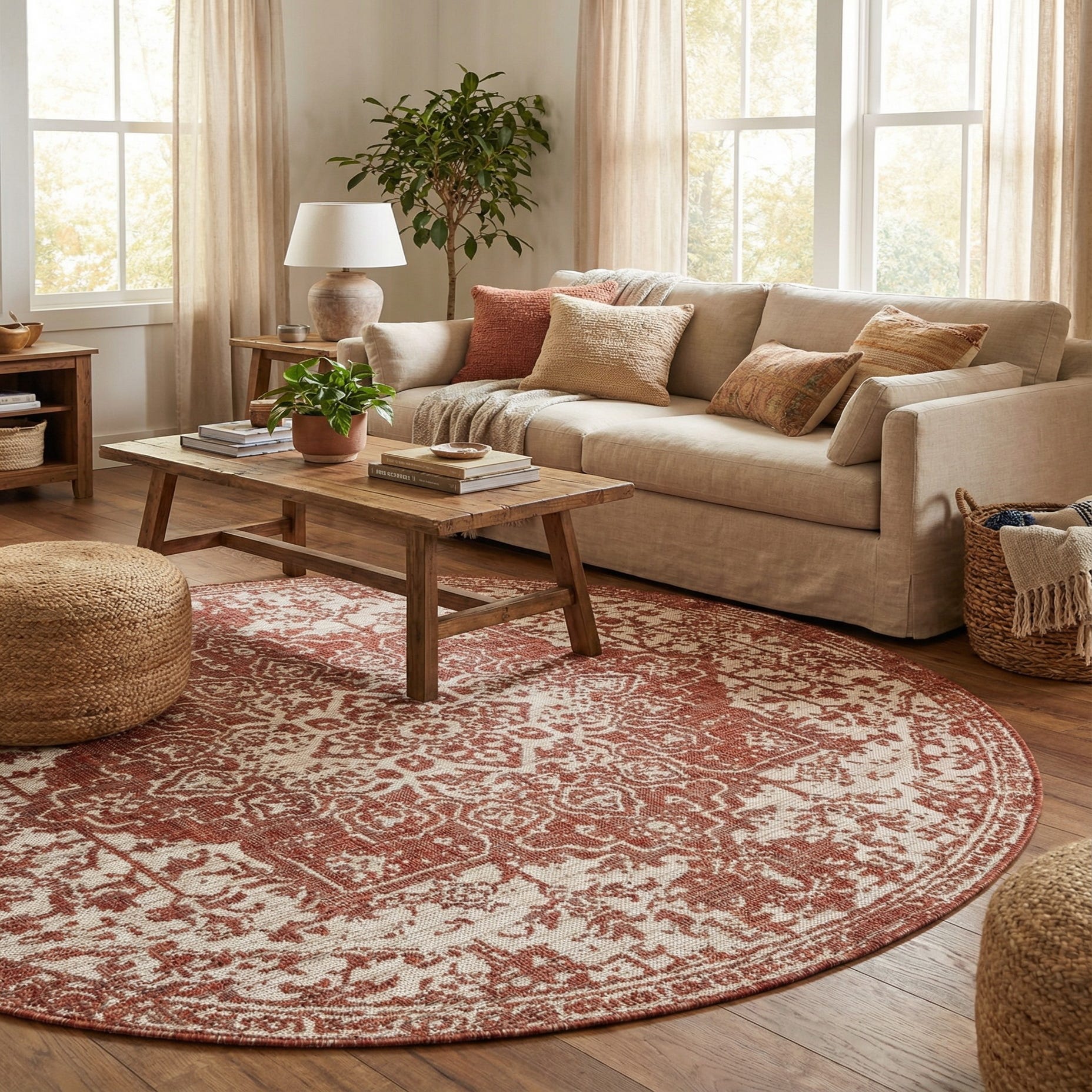 The round silhouette makes this rug ideal for anchoring circular tables in a breakfast nook, framing a cozy seating area on a covered patio or sunroom, or softening a foyer beneath an entry table. Its warm rust and ivory palette pairs beautifully with natural woods, rattan or leather seating, terracotta accents and neutral linens, and suits transitional, Mediterranean, farmhouse and bohemian design schemes.
