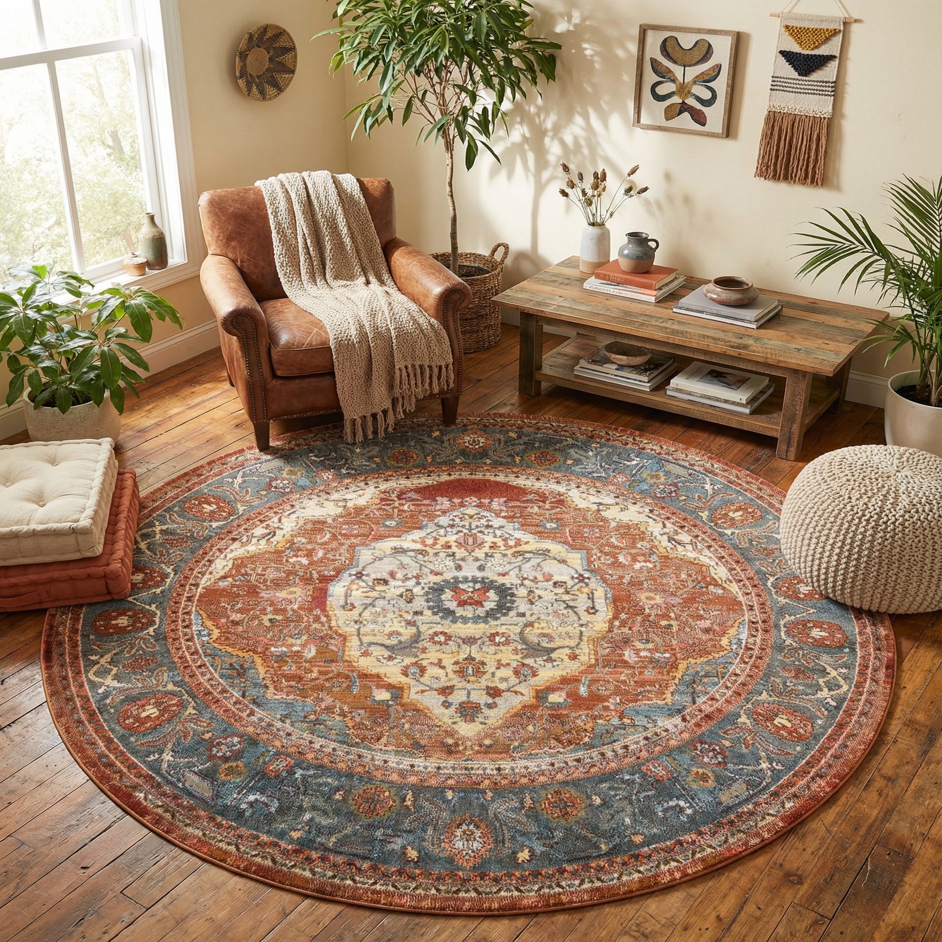 Primary color is Rust Red. Colors in this rug include: Rust Red, Blue, Ivory, Light Blue, Tan, Orange, Peach.