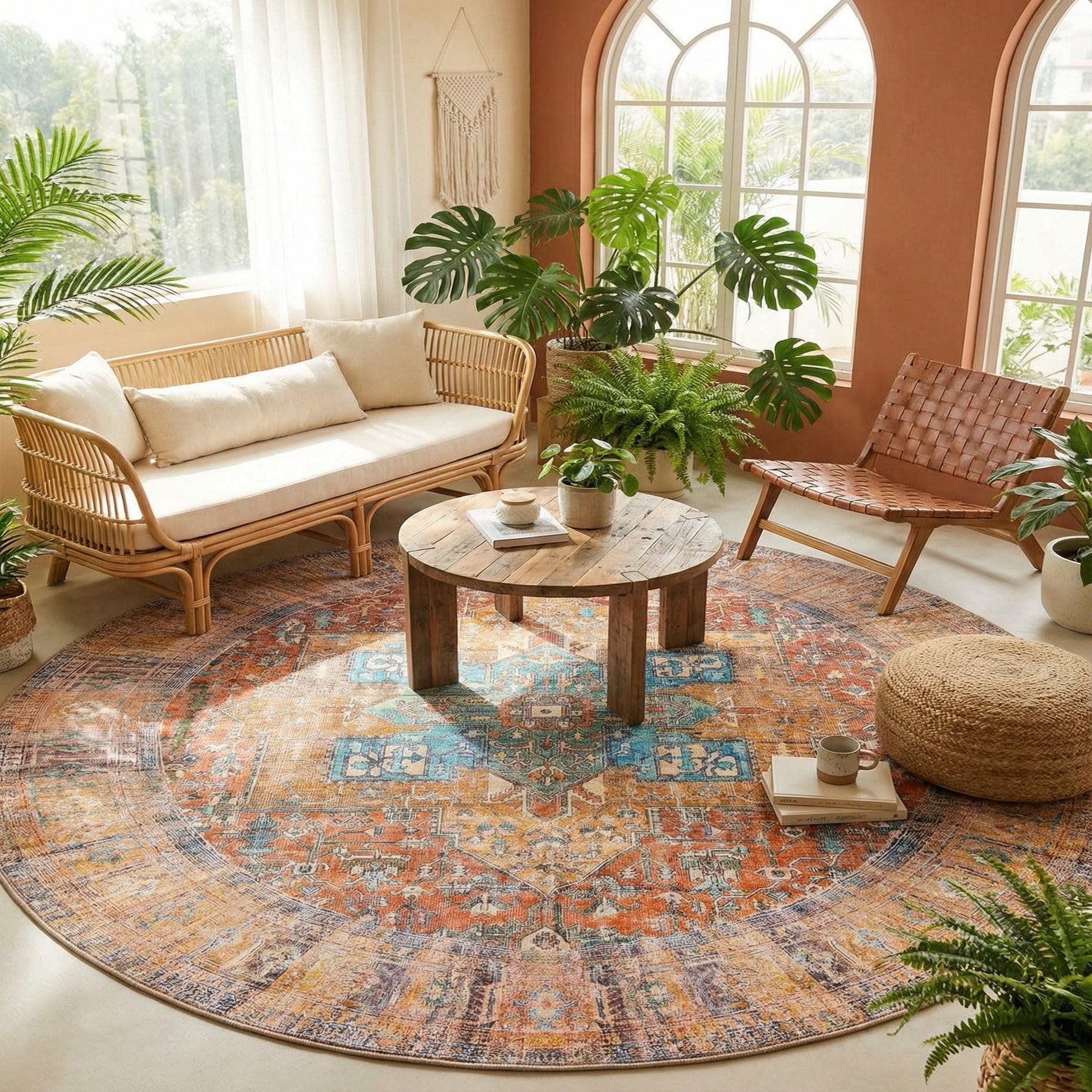 This round rug works well to anchor a seating group in a living room, add color and definition beneath a round dining table, or warm up an entry or home office without adding bulk. Pair it with warm wood tones and leather for a modern farmhouse or Mediterranean look, layer it with neutral linens and brass accents for a transitional scheme, or use it in an eclectic space with mixed textures and vintage finds to tie varied colors together.