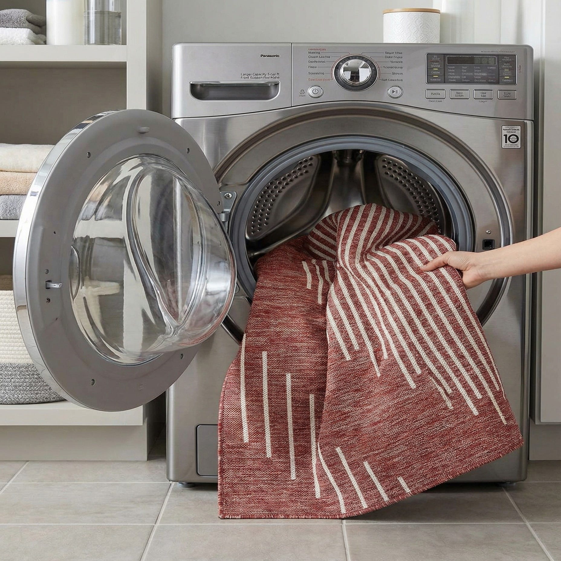 Place it on a covered patio or sunroom to anchor a conversation area, or use it indoors in a casual dining room or entry where a bold color and clear geometry make a statement. The rust tone works beautifully with warm woods and leather, while the ivory lines pair well with metal accents and light linens—ideal for modern, mid-century, or transitional settings that benefit from a strong, simple motif.