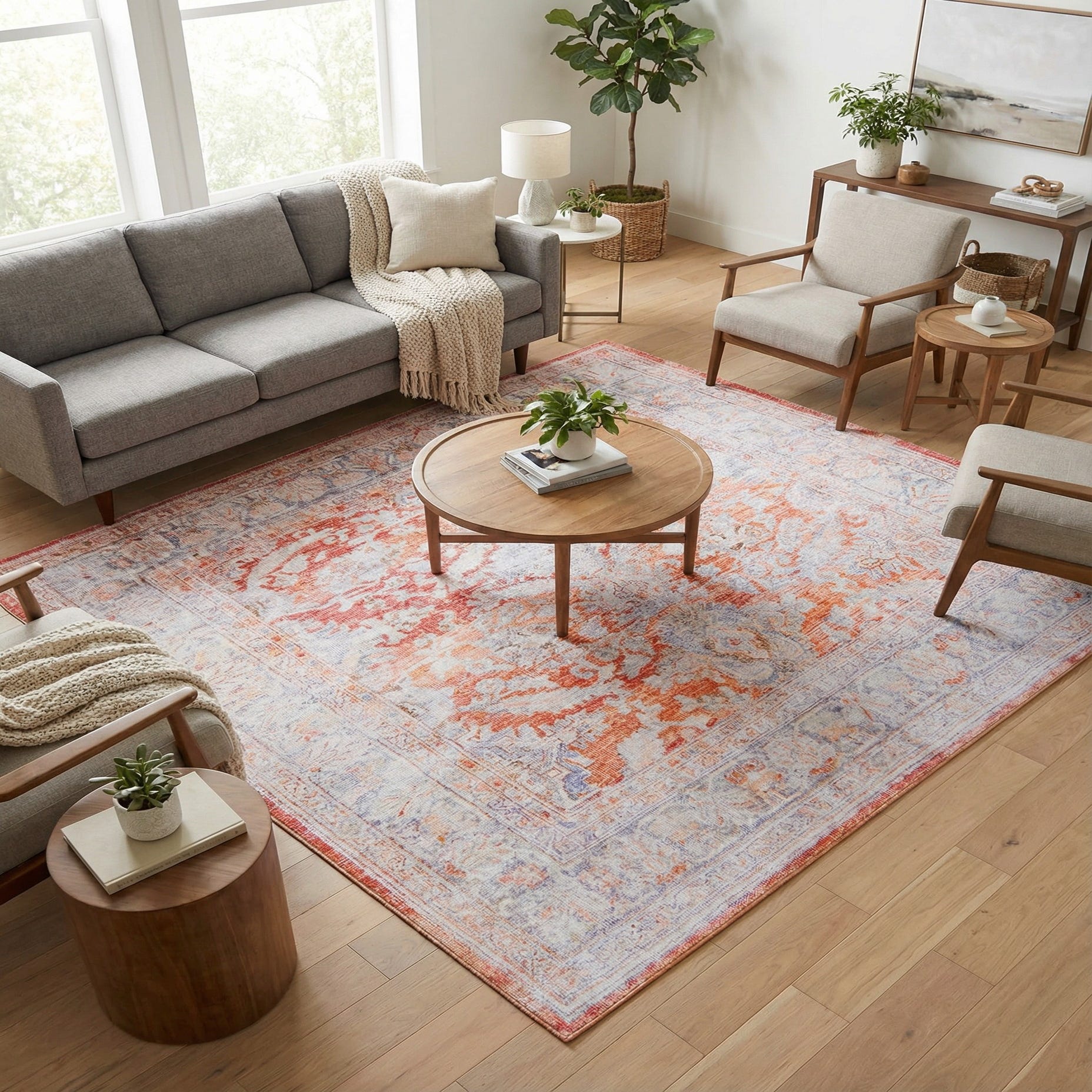 This rug anchors a seating area beautifully, pairing with neutral sofas and wooden furniture to add color without overwhelming the scheme. It works equally well in a sunlit breakfast nook or eclectic bedroom layered with natural textiles and woven baskets, and can bring warmth to an entryway or under a round dining table where its square form adds visual interest. The color mix makes it versatile with both mid-century wood tones and modern metal accents.