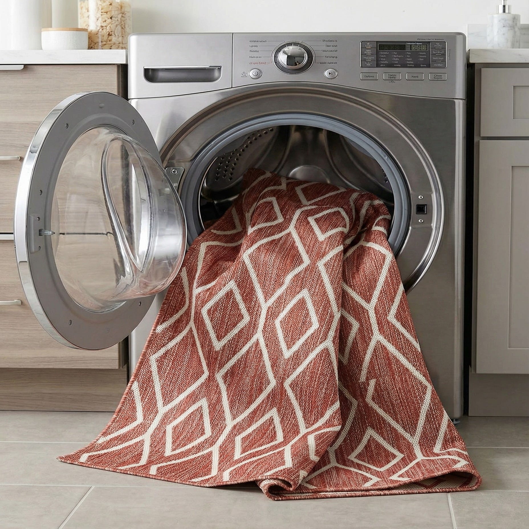A warm Rust Red background sets the stage for a repeated ivory diamond lattice that brings clear geometric rhythm to the surface. The pattern has a handwoven look with subtle vertical striations in the ground that add depth and a slightly textured, tactile quality. Machine made of 100% Polypropylene, the rug has a low-profile, flatweave feel—firm underfoot with enough texture to add visual interest without raising too much pile.