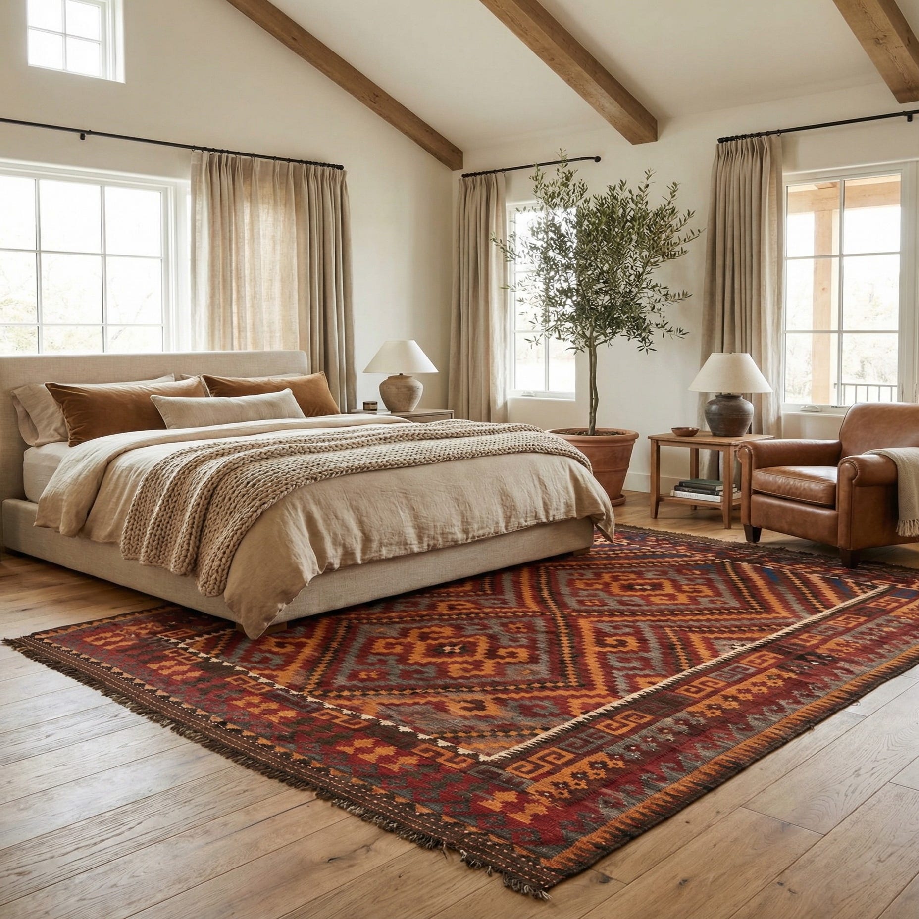 Due to its traditional motifs and warm colors, this rug would be perfectly suited for interiors that aim to evoke a sense of timelessness and groundedness. It could serve as an anchoring element in a subdued, earth-toned living space, or alternatively, it could add depth and warmth to a minimalist, modern setting that leverages clean lines and neutral backgrounds. This rug also complements decor styles such as rustic, bohemian, and eclectic, where its rich texture and pattern would harmonize well with other artisanal and worldly elements.