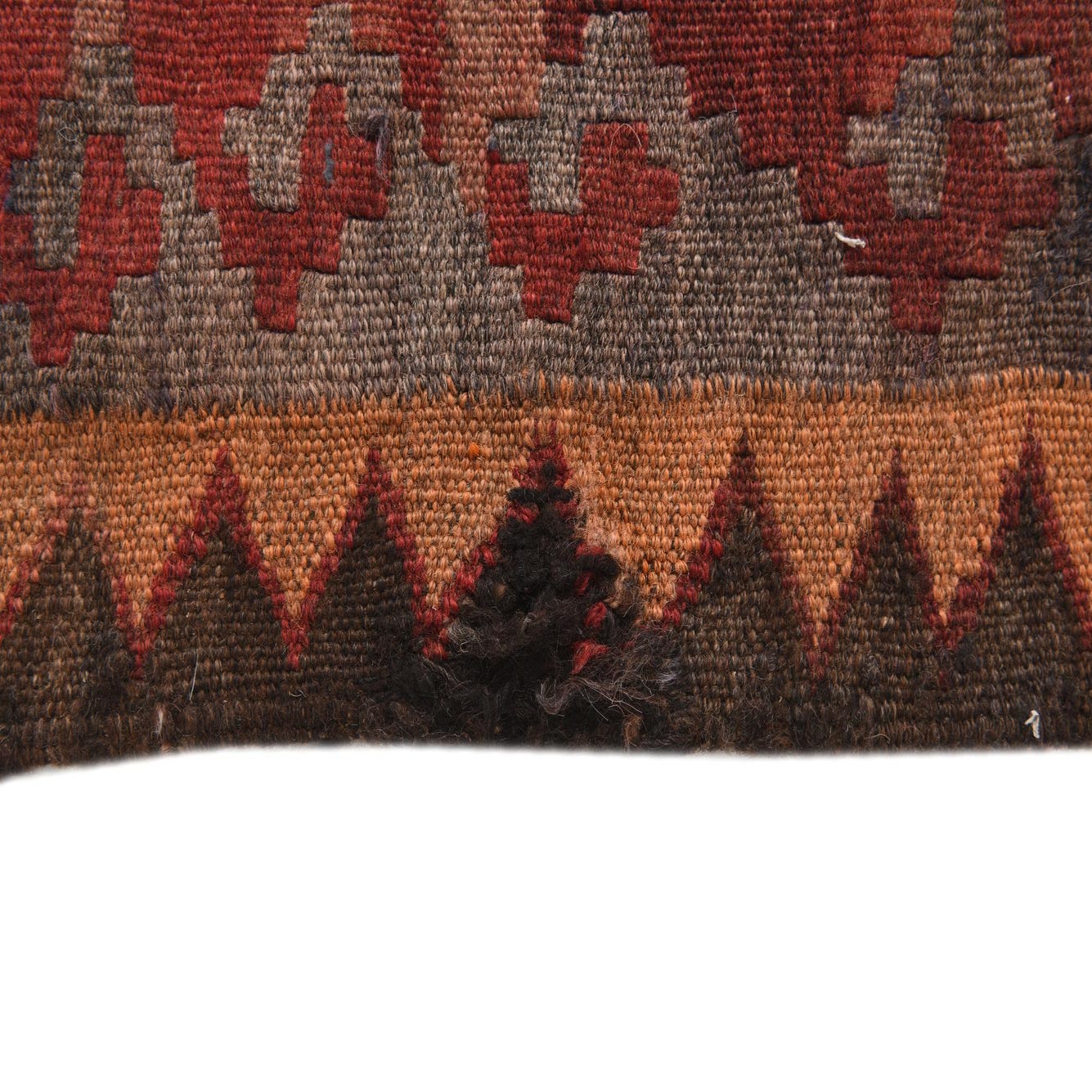 The Kilim Fars collection features a handwoven rug crafted with 100% wool, measuring 7x10 in size. This particular piece showcases a robust rust red background, complemented by a palette of beige, brown, ivory, orange, and blue, which come together to create a harmonious and traditional geometric pattern. The texture and weave of this wool rug exemplify the authentic craftsmanship inherent to its origin.