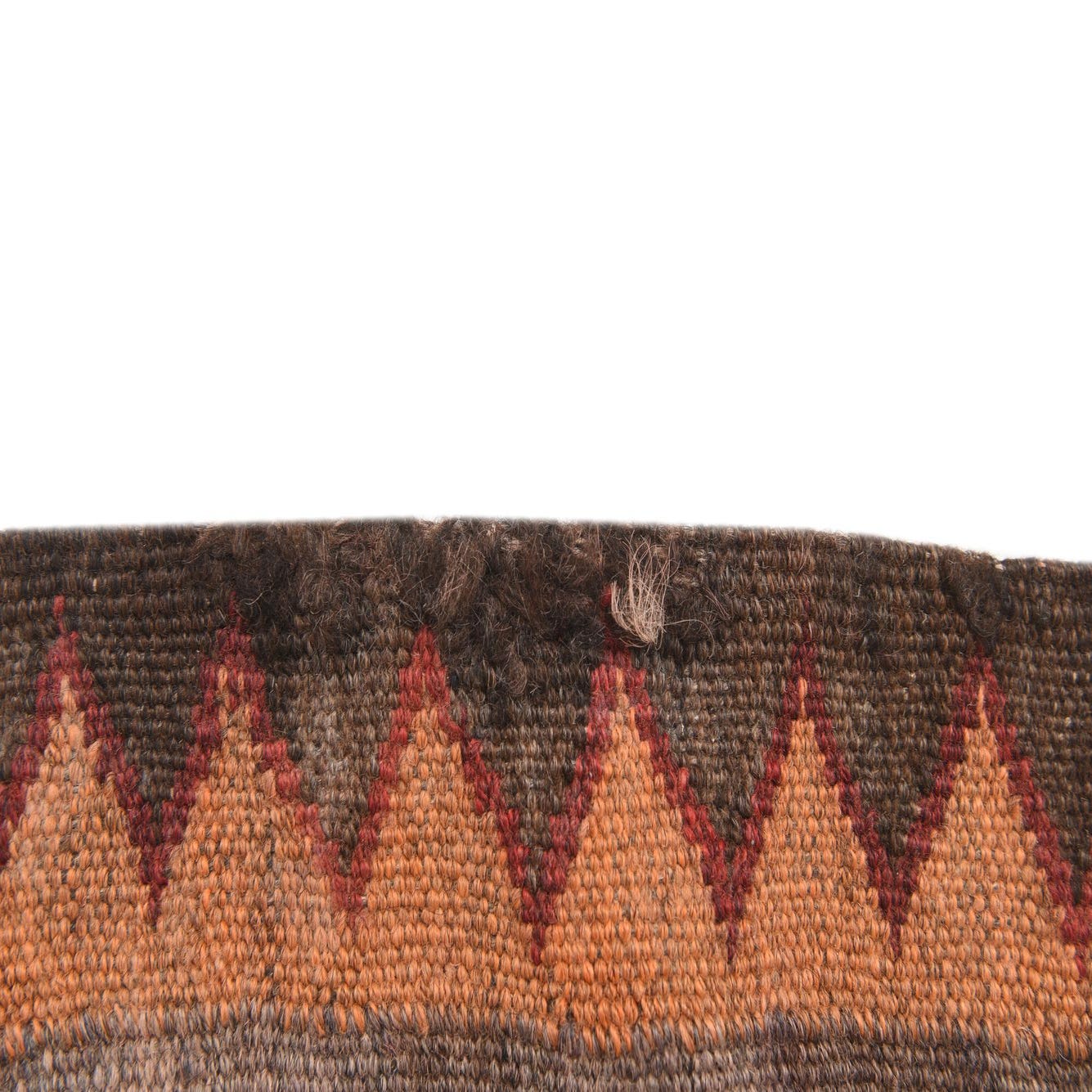 The rug's semi-antique status, being 40-60 years old, adds a layer of character and history to its aesthetic. Despite the presence of condition details such as missing fringe and a hole, the rug maintains its aesthetic integrity with the original fringe still attached, further enhancing its authentic charm.