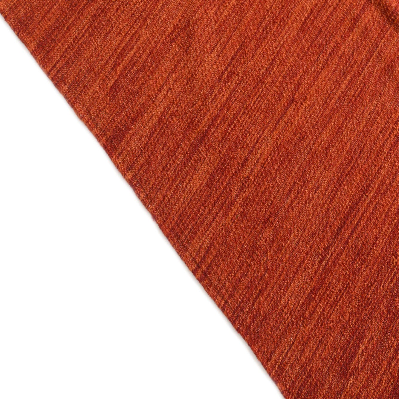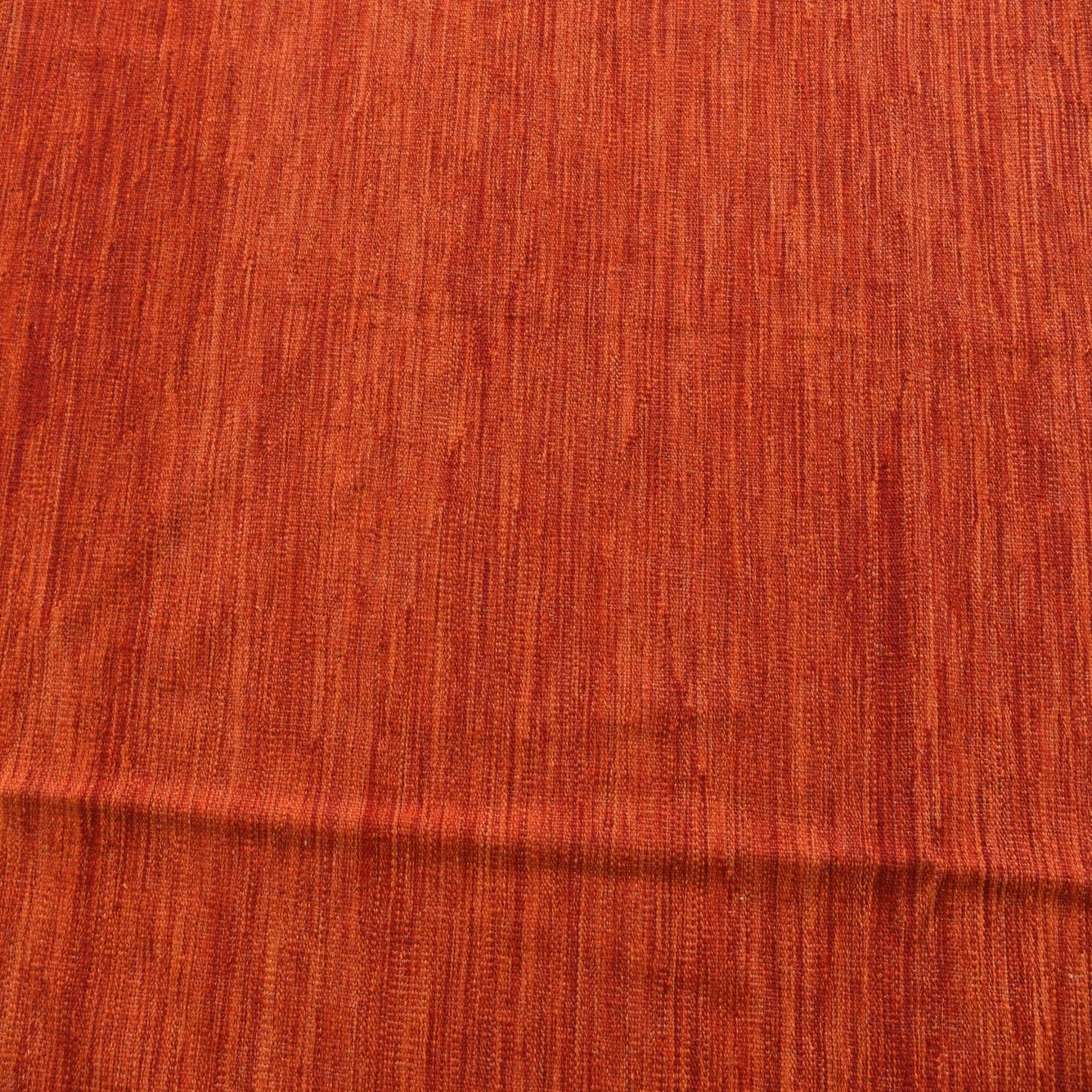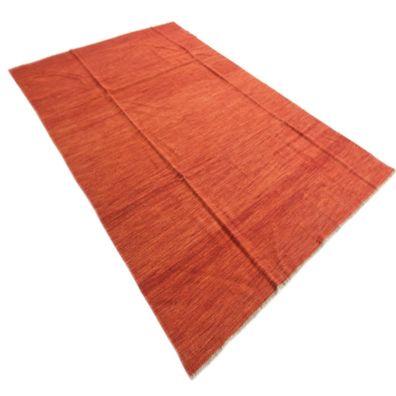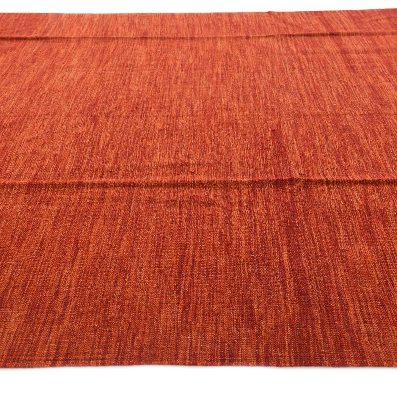 A 7x10 rectangular flatweave wool rug in vibrant shades of orange and red, featuring a subtle tribal-modern abstract pattern.