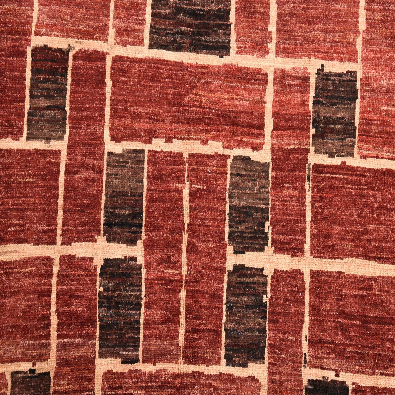 A grid of interlocking rectangular blocks sits on a warm rust red field, arranged in a rhythmic, slightly irregular pattern that gives the design a handcrafted, contemporary character. Rectangles in black, deep brown, ivory and soft peach are separated by thin ivory lines, creating a mosaic-like layout that reads modern yet grounded. Hand knotted from 100% hand-spun wool, the surface has a low, dense pile with tactile variation—you can feel the subtle ridging where the hand-spun yarns and tonal dyeing create light and shadow underfoot.