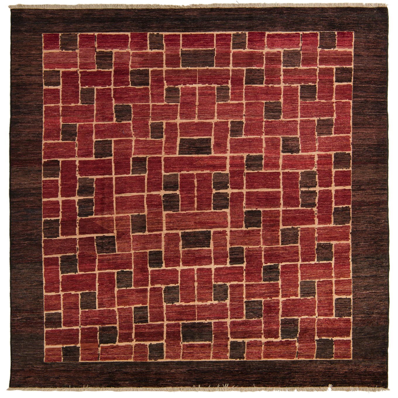 A 7x10 rectangular Modern Ziegler rug featuring a geometric pattern of red and orange blocks with dark brown accents, framed by a solid dark brown border.