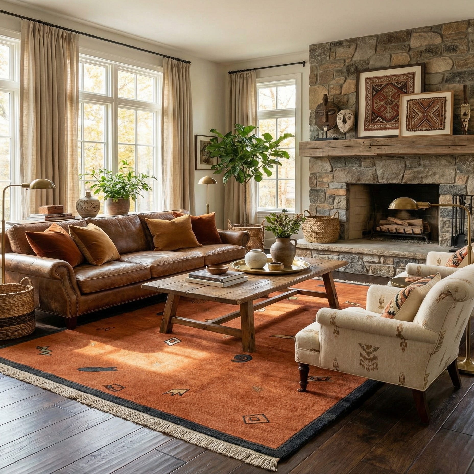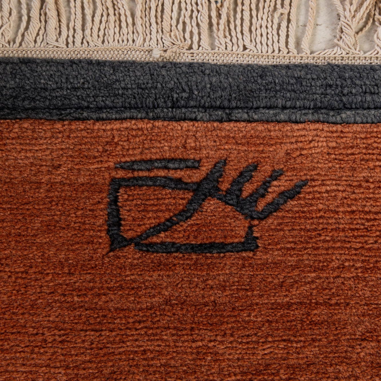A 7x10 rectangular orange wool rug with a modern abstract pattern of various colorful shapes and a dark border, suitable for a living room.