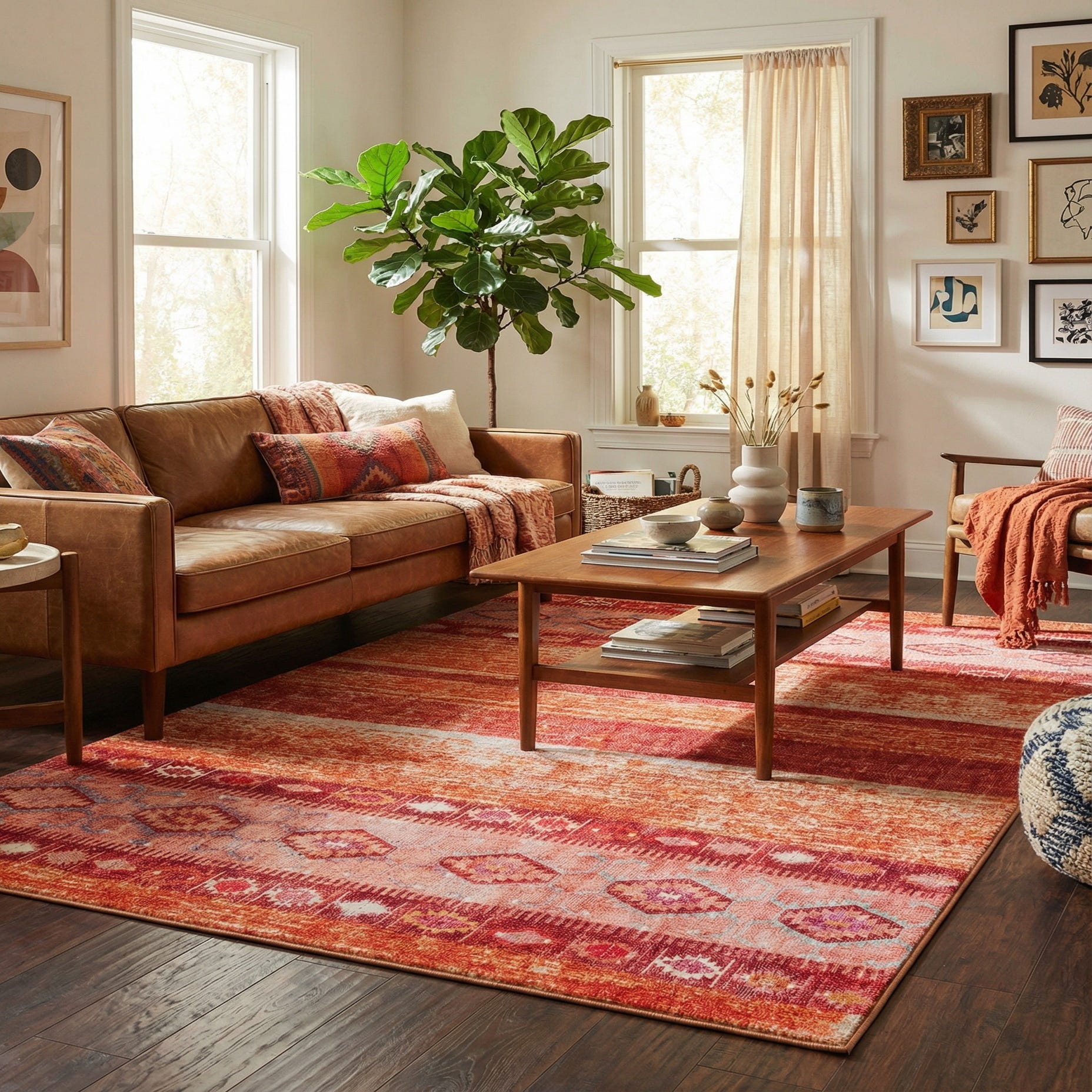 This rug works well as an anchor for a casual living room beneath a sofa and coffee table, as a colorful layer in a bohemian or eclectic bedroom, or under a dining table paired with warm wood tones. It pairs nicely with neutral upholstery and natural materials—think rattan, leather, or light-stained wood—and with accent pillows or artwork that pick up the orange or violet tones for a cohesive scheme.