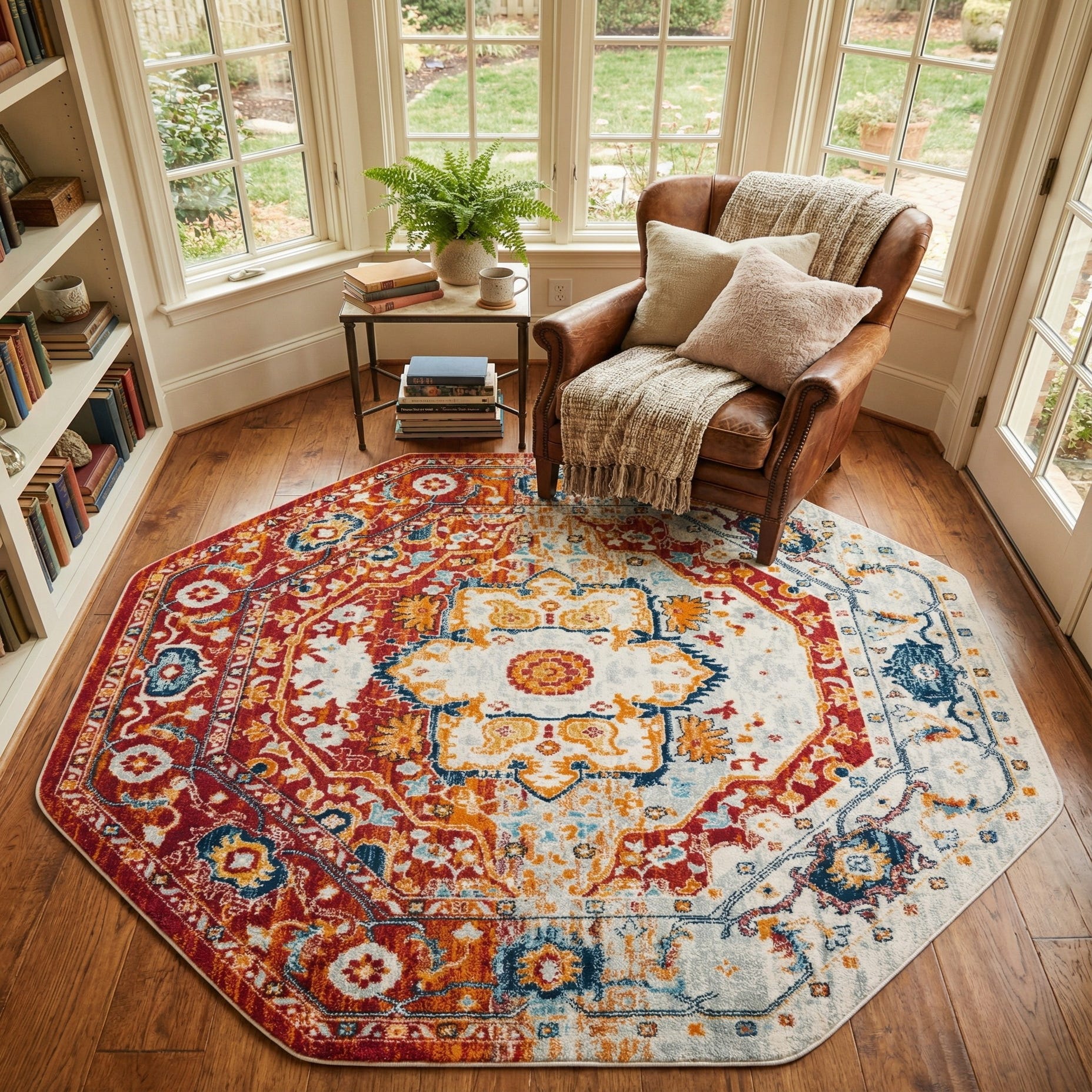 The octagonal shape adds architectural interest and works well beneath a round dining table, in an entry foyer, or anchored under a small seating arrangement. Pair it with warm wood tones, navy or gray upholstery, and mixed metals for contrast; it also complements transitional, global-inspired, or bohemian interiors where layered patterns and rich color palettes are welcome.