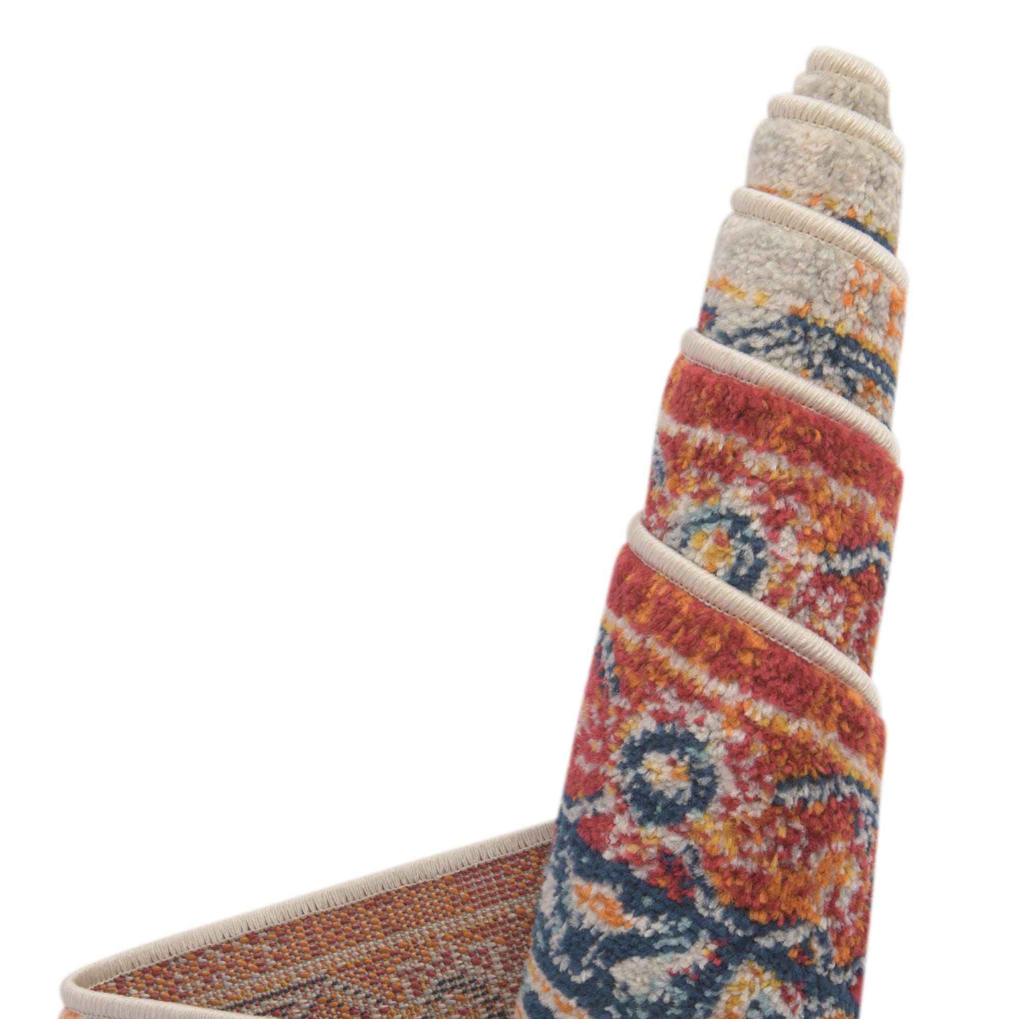 Primary color is Rust Red. Colors in this rug include: Rust Red, Gray, Ivory, Navy Blue, Red, Orange.