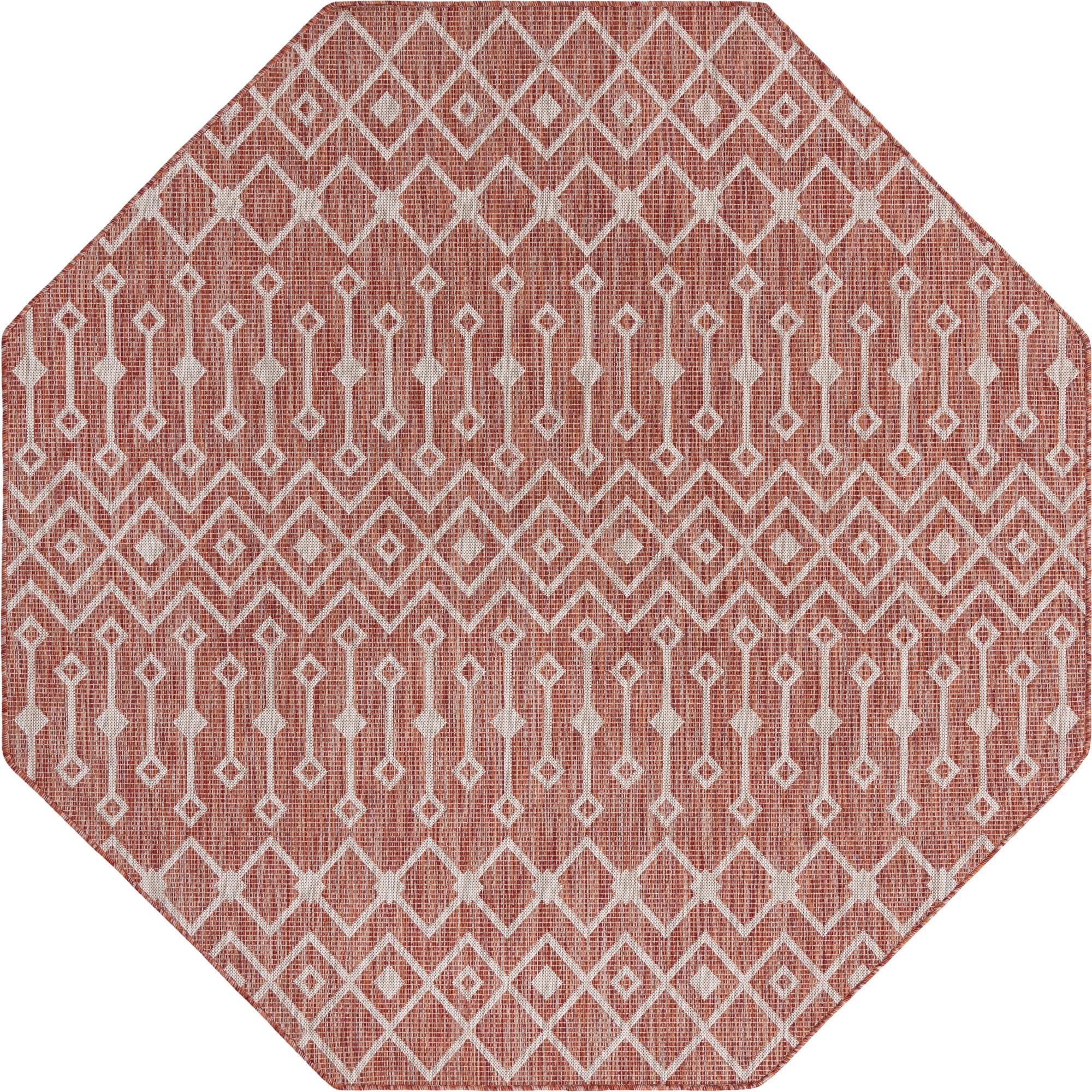 The octagonal silhouette defines a conversation area or focal spot, making this piece a good choice for a covered patio, screened porch, or a sunroom where a compact, shaped rug can anchor seating. It also works well under a bistro table or at the center of a casual dining area. Pair it with weathered wood or charcoal metal furnishings, soft-gray cushions, and woven wicker or rattan to balance the rust tones, or use it to add warmth to a cool?toned modern interior.