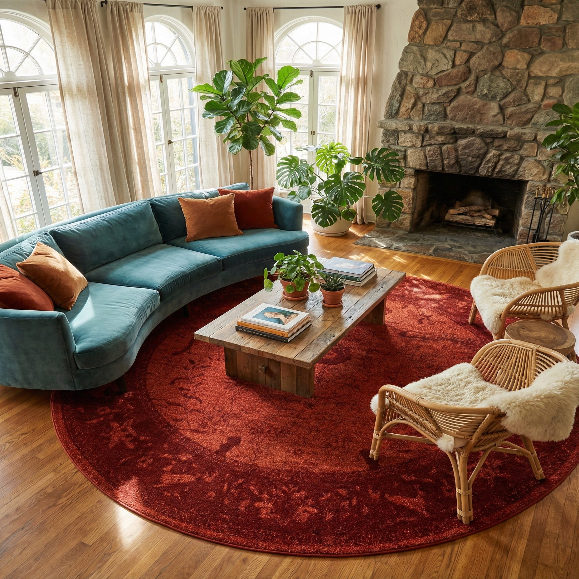 This round shape works well beneath a circular dining table, centered in a seating arrangement, or layered in an entry or home office to introduce a warm focal point. It pairs naturally with warm woods, leather seating, and neutral linens, and complements southwestern, mid-century, or contemporary eclectic interiors that benefit from a concentrated wash of rust and terracotta tones.