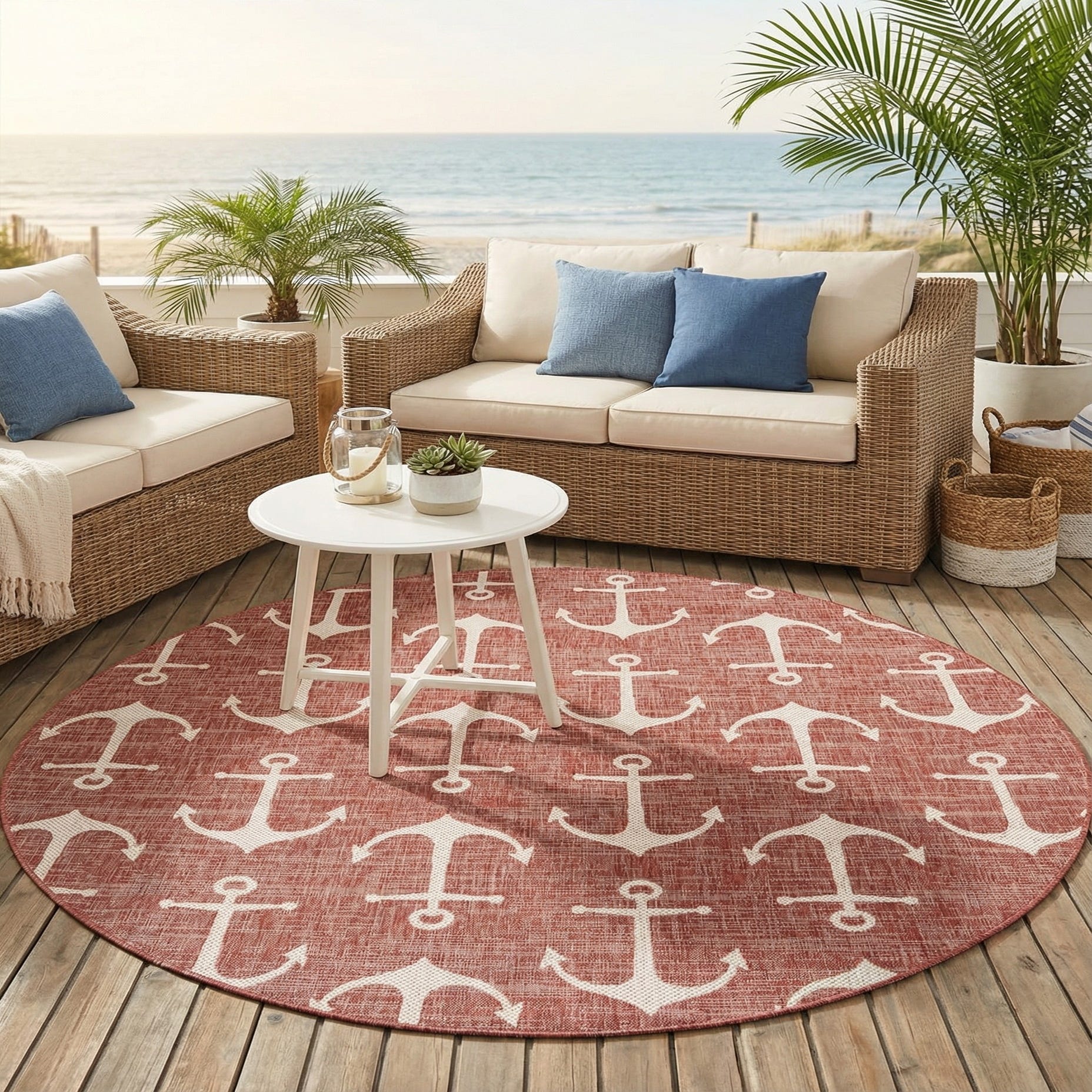 A round, flatweave 7' 10" x 7' 10" indoor/outdoor rug with a red-orange background and repeating white anchor pattern, perfect for a patio.