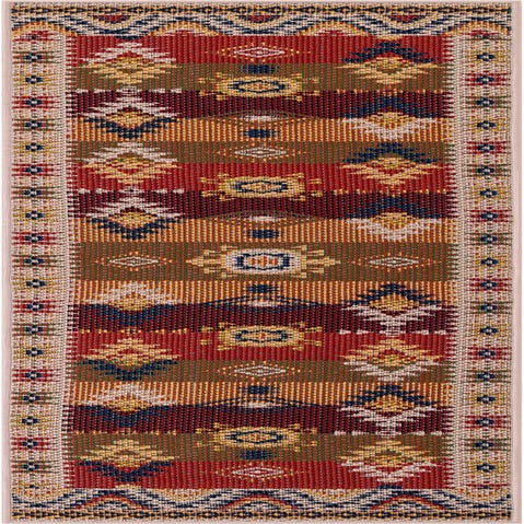 Primary color is Rust Red. Colors in this rug include: Rust Red, Black, Blue, Green, Yellow, Orange.