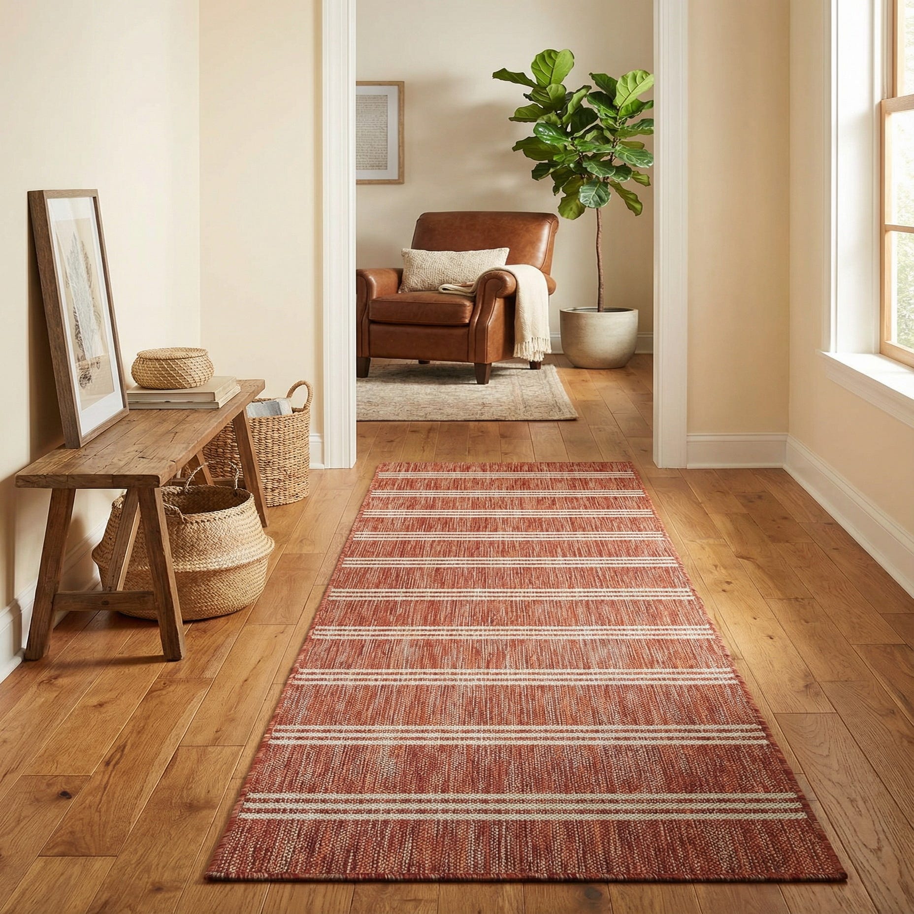 The rug's stain-resistant nature and flatweave construction offer a practical solution for high-traffic areas, while also being pet-friendly and shed-free, maintaining a neat appearance over time. Its simple yet striking color palette can harmoniously anchor a room's decor, particularly in settings that aim for warmth and welcome. The rust red background accented by stripes introduces an earthy element that could be artfully paired with natural wood tones, or used to add depth to a neutral interior color scheme. This runner is a versatile addition to either indoor living spaces or covered outdoor environments, adding both functionality and understated charm.