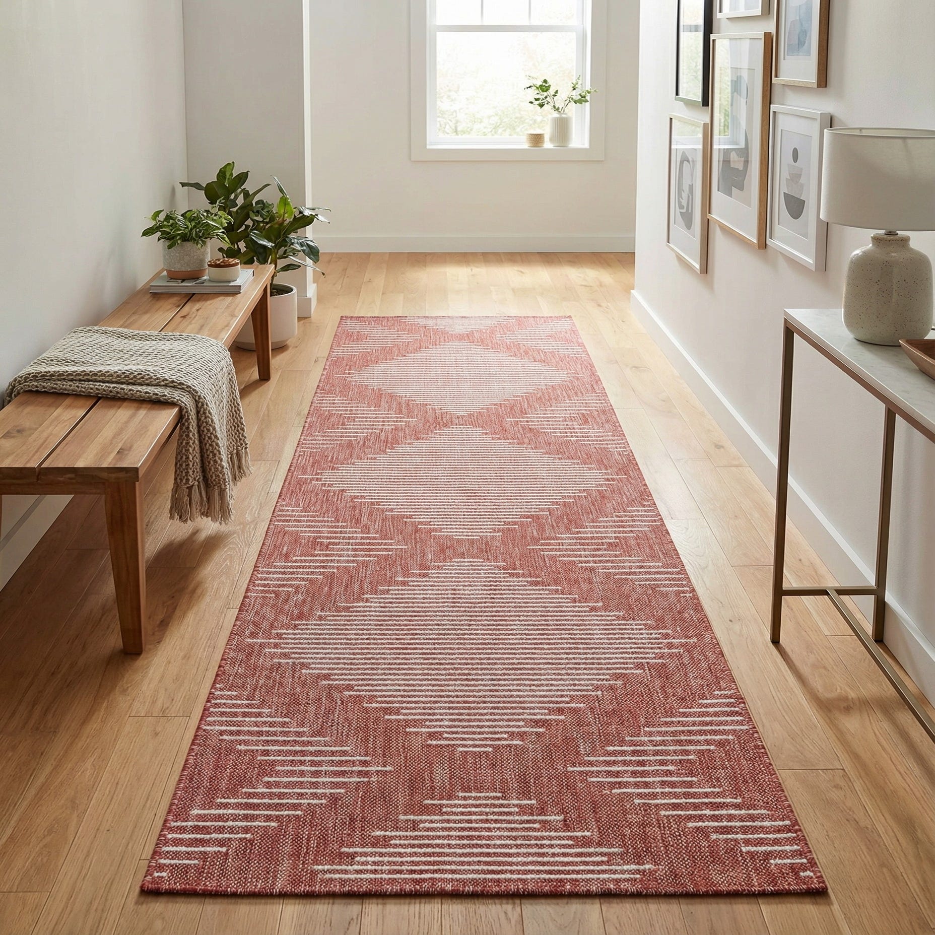 An 8 ft runner rug in shades of orange and red with a modern Southwestern geometric stripe pattern, suitable for indoor/outdoor use.