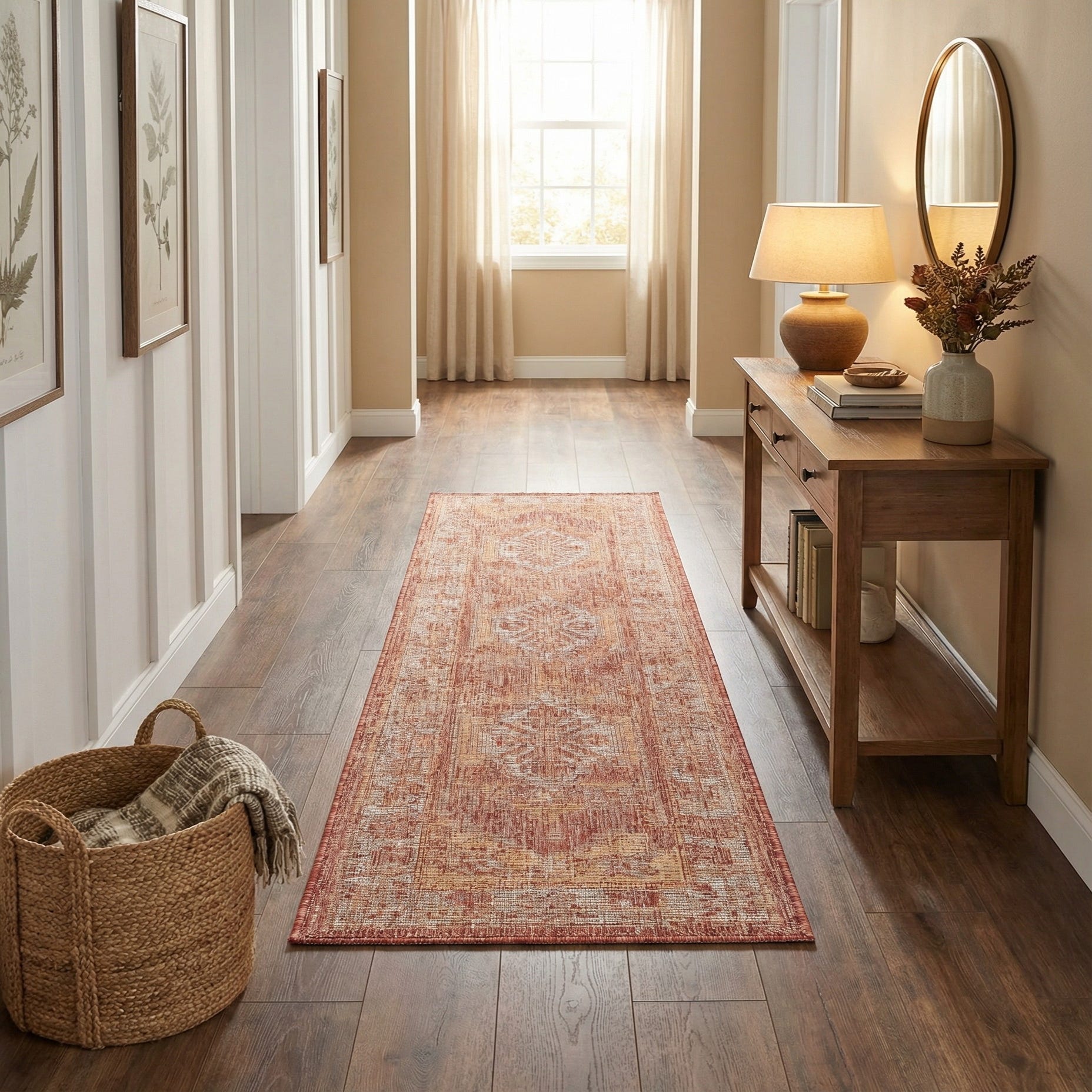 An 8 ft runner rug in shades of orange and red, featuring a subtle Southwestern-inspired traditional pattern, suitable for indoor/outdoor use.