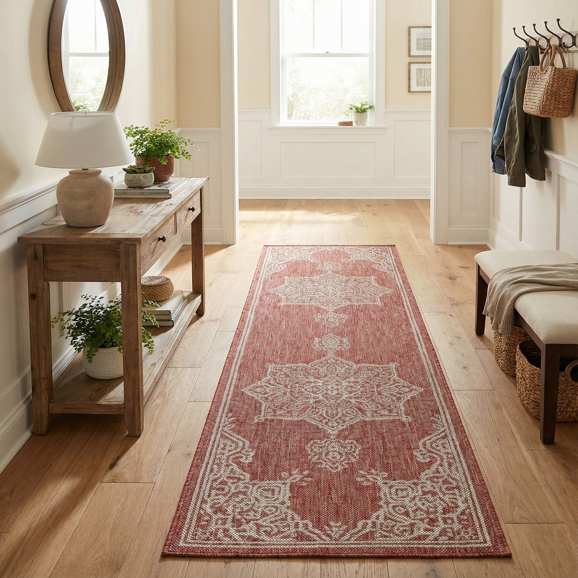 This runner works well in entryways, hallways, and on covered porches where a touch of classic pattern can anchor a long, narrow space. Pair it with warm wood floors, iron or matte-black hardware, and neutral upholstery to balance the richer rust tone; it also complements gray or stone tile and layered outdoor seating on a patio. Its traditional motif and durable construction make it well-suited to transitional, farmhouse, or classic outdoor living schemes.