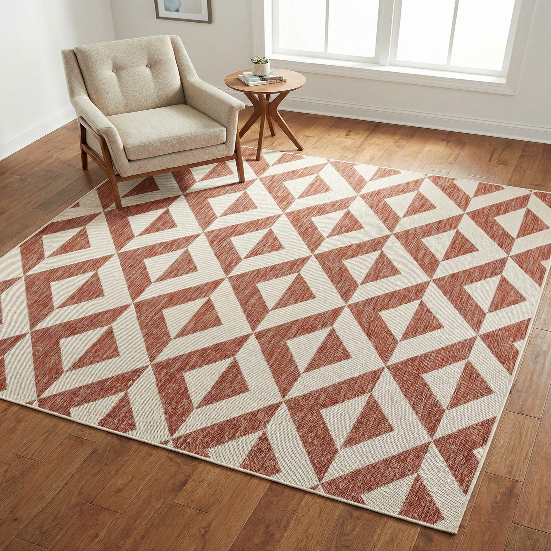 The Jill Zarin Outdoor Collection offers a sophisticated and durable 8 Ft Square rug that complements a variety of outdoor and indoor spaces. Crafted with machine-woven 100% polypropylene, this rug showcases a dynamic geometric pattern set against a rust-red background, accented by ivory shapes, creating a bold and contemporary aesthetic. The flatweave construction delivers a sleek profile and a texture that is pleasing underfoot.