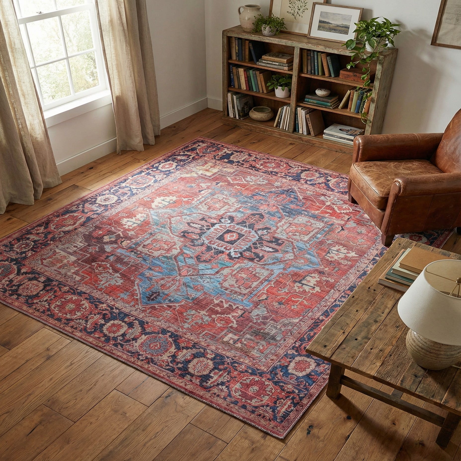 Rich, rust red forms the background of this square rug, centered by a bold medallion rendered in shades of blue and turquoise with gray and navy blue accents. The field is filled with stylized floral and geometric motifs and finished with a navy blue border that repeats ornate rosette and cartouche patterns. A deliberately distressed, antique-inspired surface gives the design layered color variation and visual depth, letting the cooler blues and grays sit comfortably against the warm rust ground.