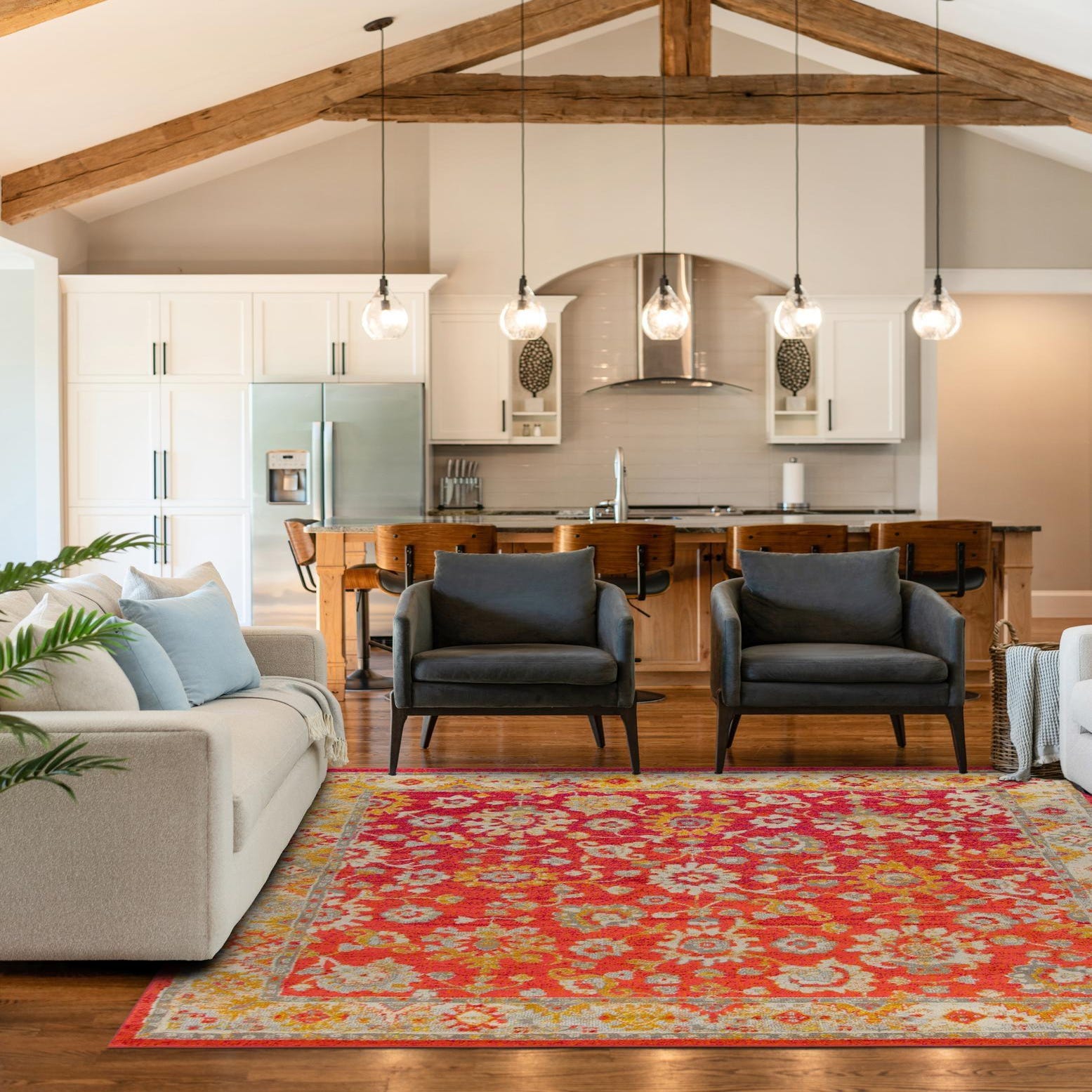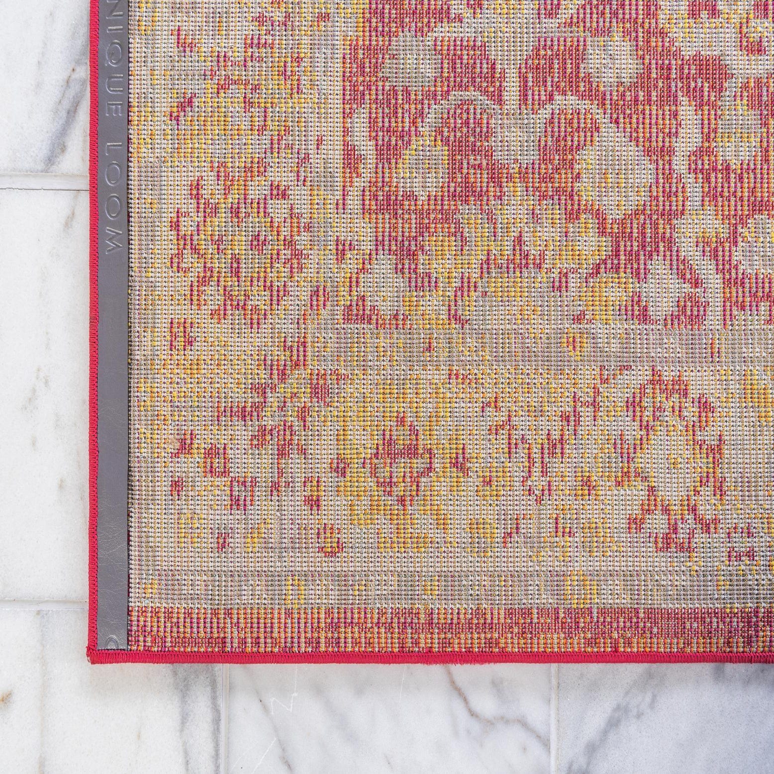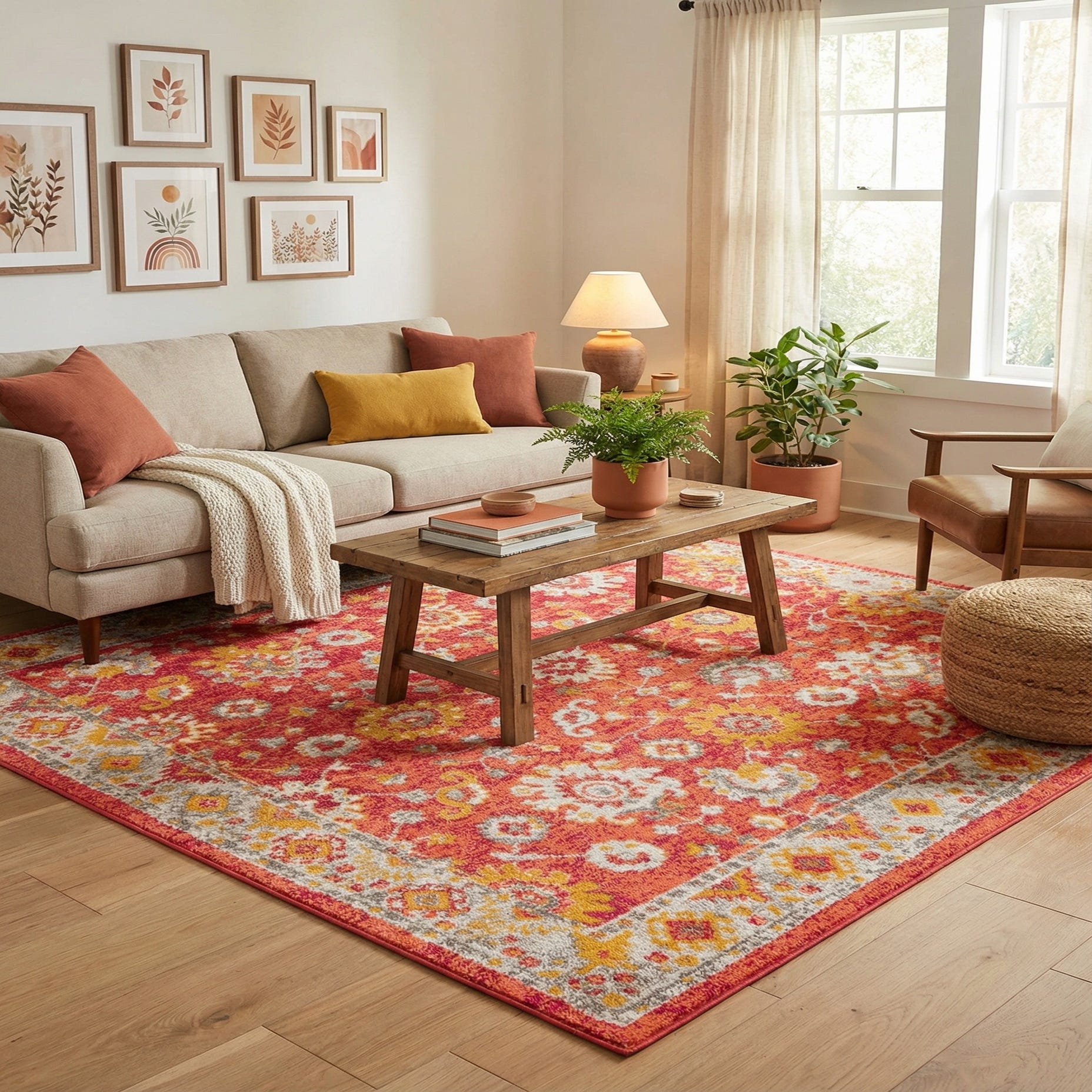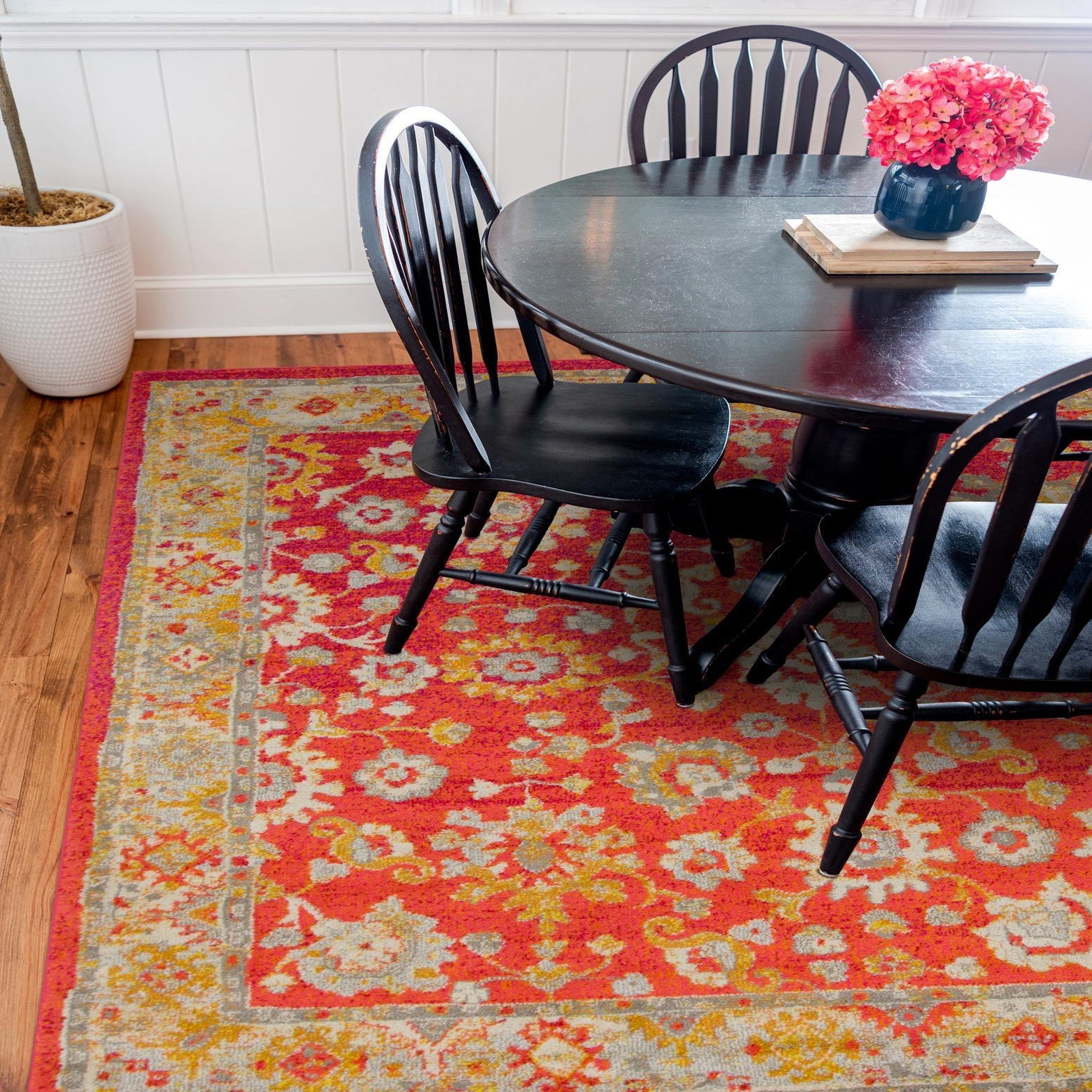 Machine-made from 100% polypropylene, this rug has a low, even pile that feels soft underfoot and presents the pattern with clear, consistent definition. Its color-forward palette and traditional patterning make it a flexible foundation: place it under a neutral linen sofa to add warmth and visual interest, pair it with midcentury wood furniture for a lively contrast, or use it to anchor a bright, layered bohemian space. The bold background and thoughtful accents also make it a strong choice for entryways or family rooms where a welcoming, colorful focal point is desired.
