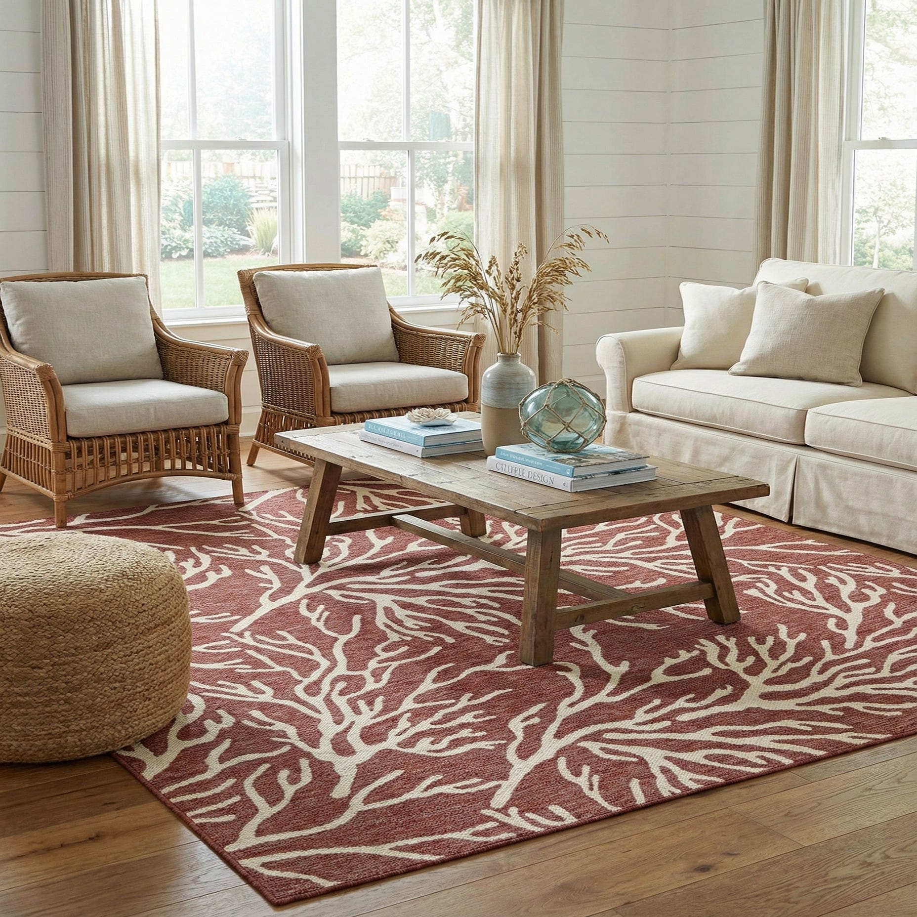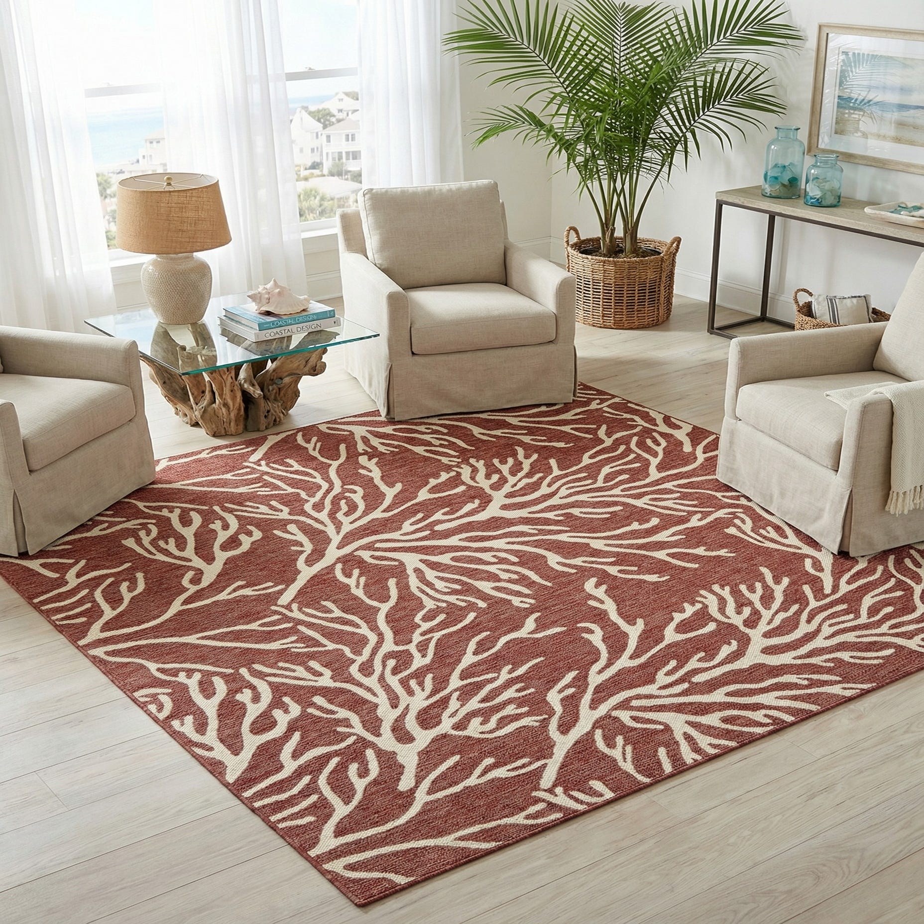 A bold, coral-branch motif in ivory spreads across a warm rust red background, creating a coastal-inspired look with clear, organic lines. The pattern reads like hand-drawn branches, repeating at a comfortable scale that adds visual interest without overwhelming a space. Machine made of 100% polypropylene, the rug has a low-profile, tightly woven surface you can feel underfoot—firm with a subtle texture that holds the pattern definition and maintains a neat, finished edge.