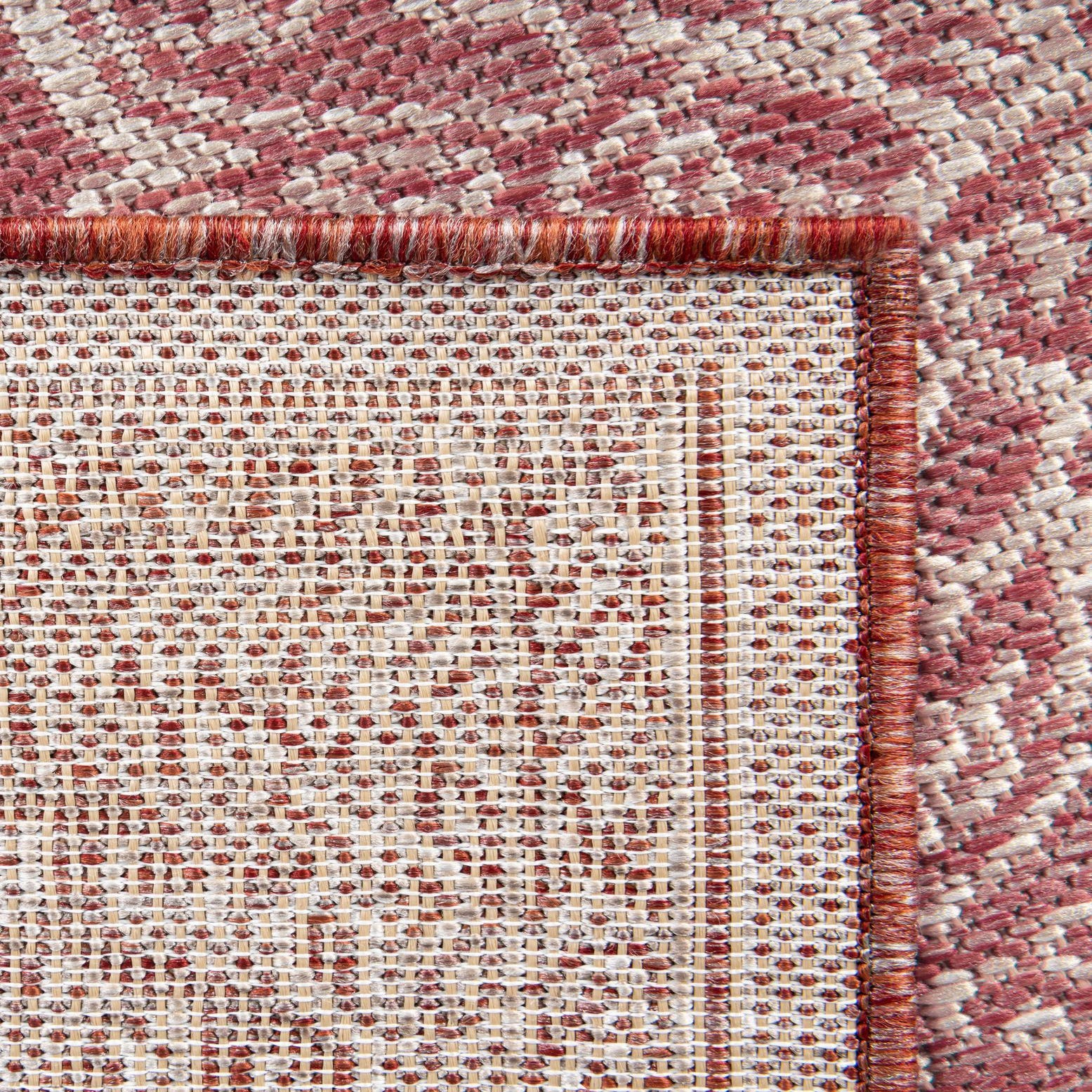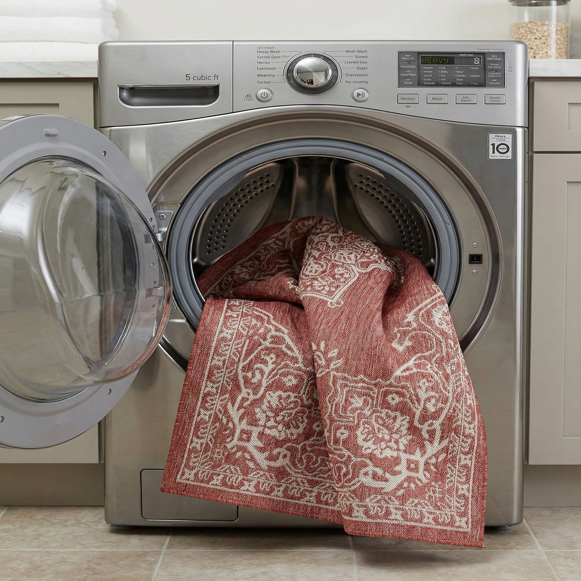 A classic central medallion anchors this outdoor rug, its intricate floral and arabesque motifs worked in ivory and gray against a warm rust red background. Corner cartouches and a narrow decorative border echo the medallion’s detailing for a balanced, traditional layout. Machine-made from 100% polypropylene, the rug has a low-pile, tightly woven construction with a subtle ribbed texture that feels smooth underfoot while retaining a textile-like look.