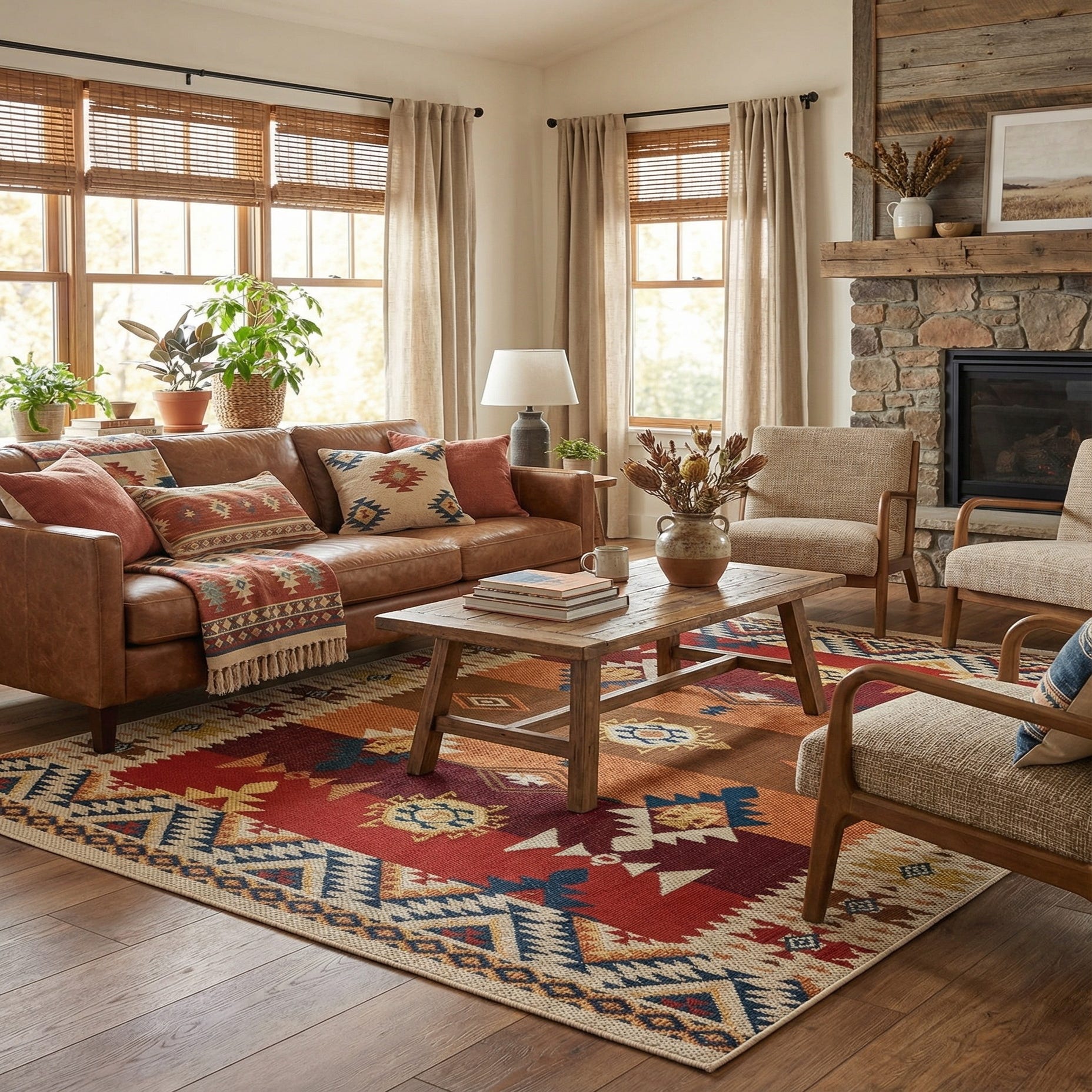 Machine-made from 100% polypropylene, the rug has a low-profile, flatweave texture that feels firm underfoot and holds shape well in high-traffic or outdoor areas. It pairs naturally with wood tones, leather seating and woven rattan for a relaxed, lodge or boho vibe, and it also anchors a covered patio or screened porch where color and pattern can stand up to everyday use. Use it to add warmth and pattern beneath a dining table, in an entryway to define the space, or layered in a living room with neutral upholstery and navy or brass accents.