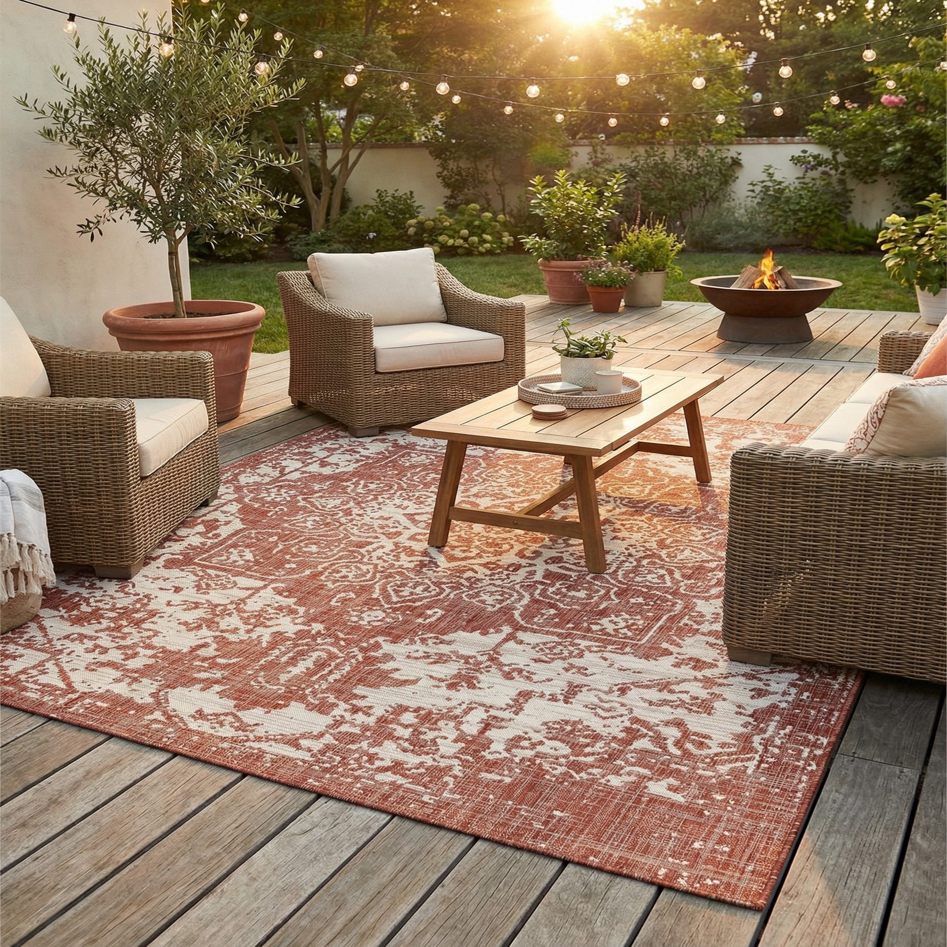 A warm rust red field sets the stage for an ivory, distressed medallion and allover floral motif that reads like a gently worn heirloom. The central medallion and surrounding arabesques are softened by faded areas and a subtle border, creating a vintage-inspired, relaxed look. Run your hand across the surface and you'll notice a low-profile, tightly woven texture—machine-made from 100% polypropylene—so the weave feels firm with a slight texture underfoot rather than a lofty pile.