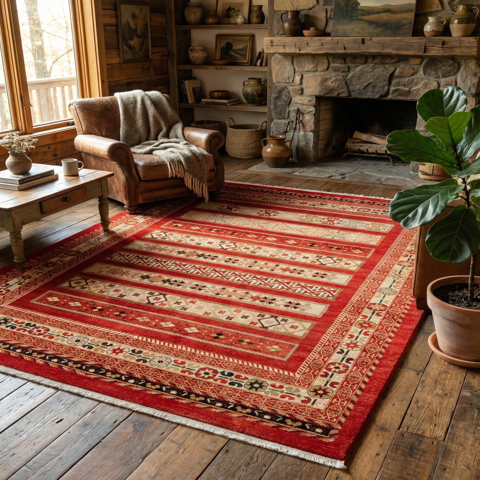 This rug works well as an anchor beneath a sofa grouping or layered in a cozy reading corner, pairing naturally with warm wood tones, leather seating and neutral upholstery. It also complements eclectic or bohemian schemes when mixed with textured throws and patterned pillows, and it can bring color and pattern into a formal dining room without appearing busy. Match surrounding textiles to the rug’s beige or light blue accents to create balance, or lean into the rust red background for a richer, more grounded palette.