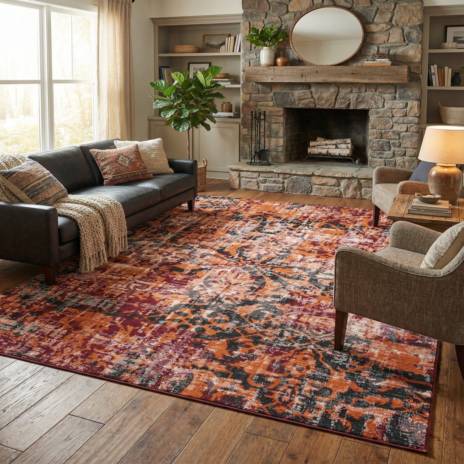 The design blends traditional motifs with a modern, worn finish, making it work well in a variety of interiors. Use it to anchor a living room seating area beneath a sofa and coffee table, bring warmth and color to a dining space, or add an inviting focal point in an entry or home office. Pair with warm wood furniture and leather seating for a cozy, layered aesthetic, or combine with black metal accents and clean-lined pieces for a modern-eclectic vibe.