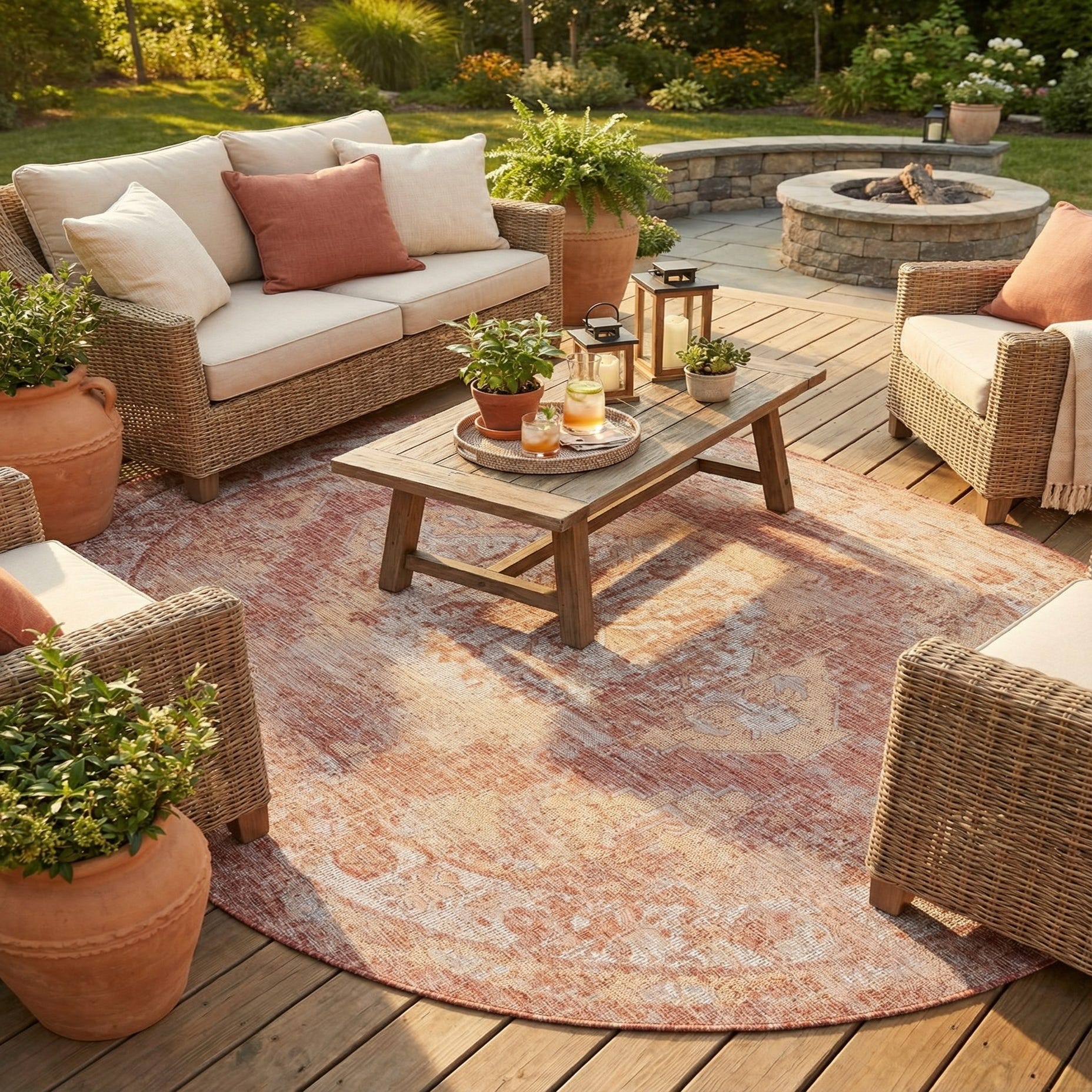 Pet-friendly and shed-free characteristics are added conveniences, making this rug an ideal choice for pet owners. Its understated design works well in various decor scenarios, from a traditional patio to a casual contemporary sunroom, and even in transitional indoor spaces that blur the boundary between the indoors and outdoors.