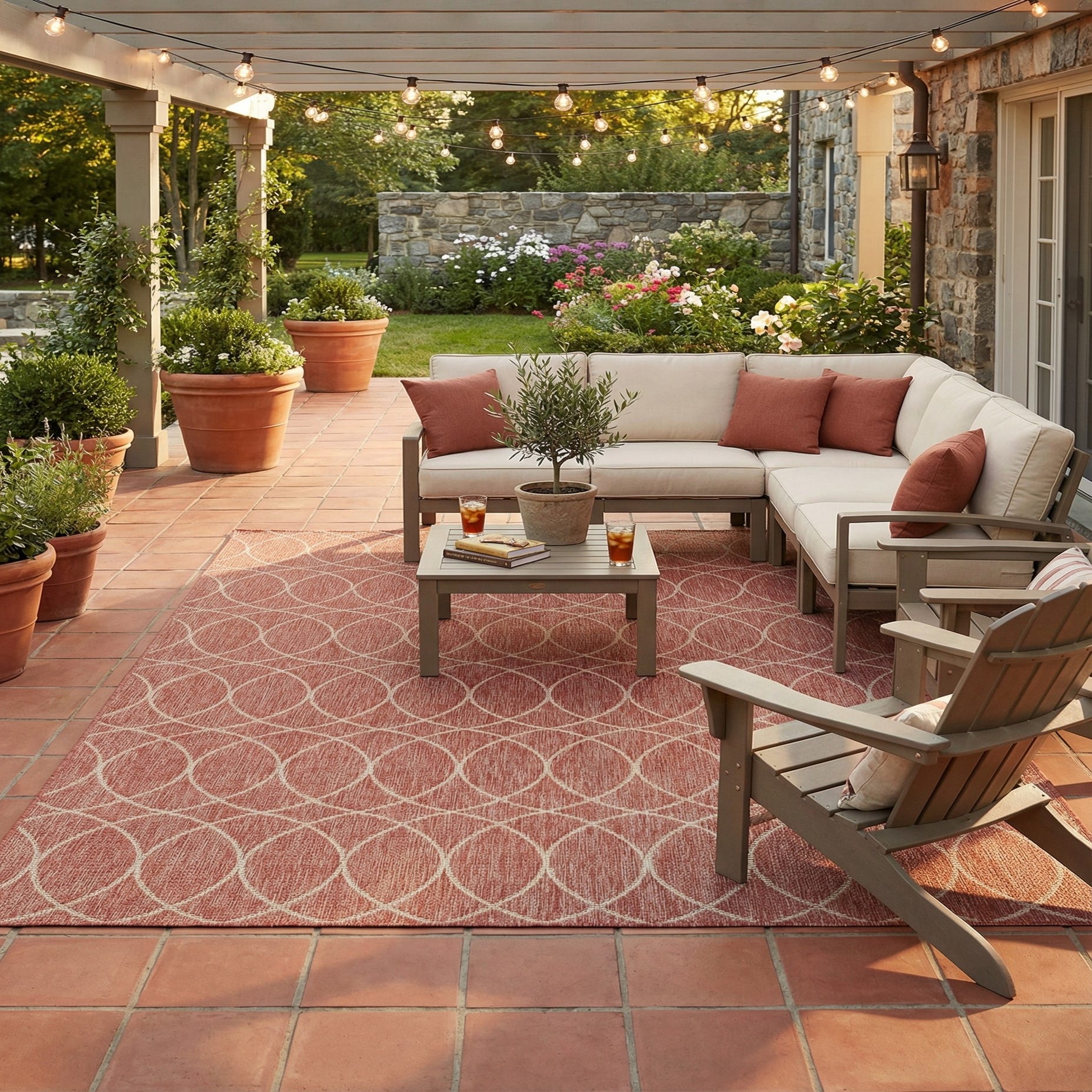 The Outdoor Lattice Collection presents a sophisticated 8x11 area rug with a balanced interplay of color and pattern. The main field is a warm rust red, providing a rich backdrop for the overlaying lattice design. The recurring lattice motif is rendered in a complementary gray, enclosed with touches of ivory highlighting the geometry of the pattern.
