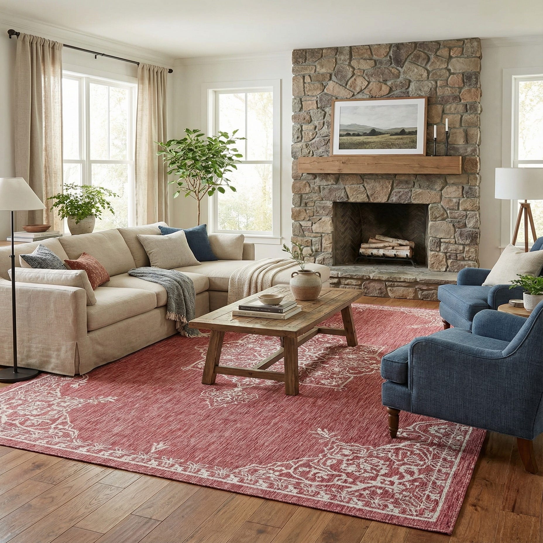 This rug works well on a covered patio or sunroom where the rich rust red brings warmth to outdoor seating, and it also pairs nicely with a casual living or dining room scheme—think weathered wood tables, neutral linen upholstery, and charcoal or gray accent pieces. Use it to anchor a seating group, define an al fresco dining area, or add color and pattern to a transitional entryway.