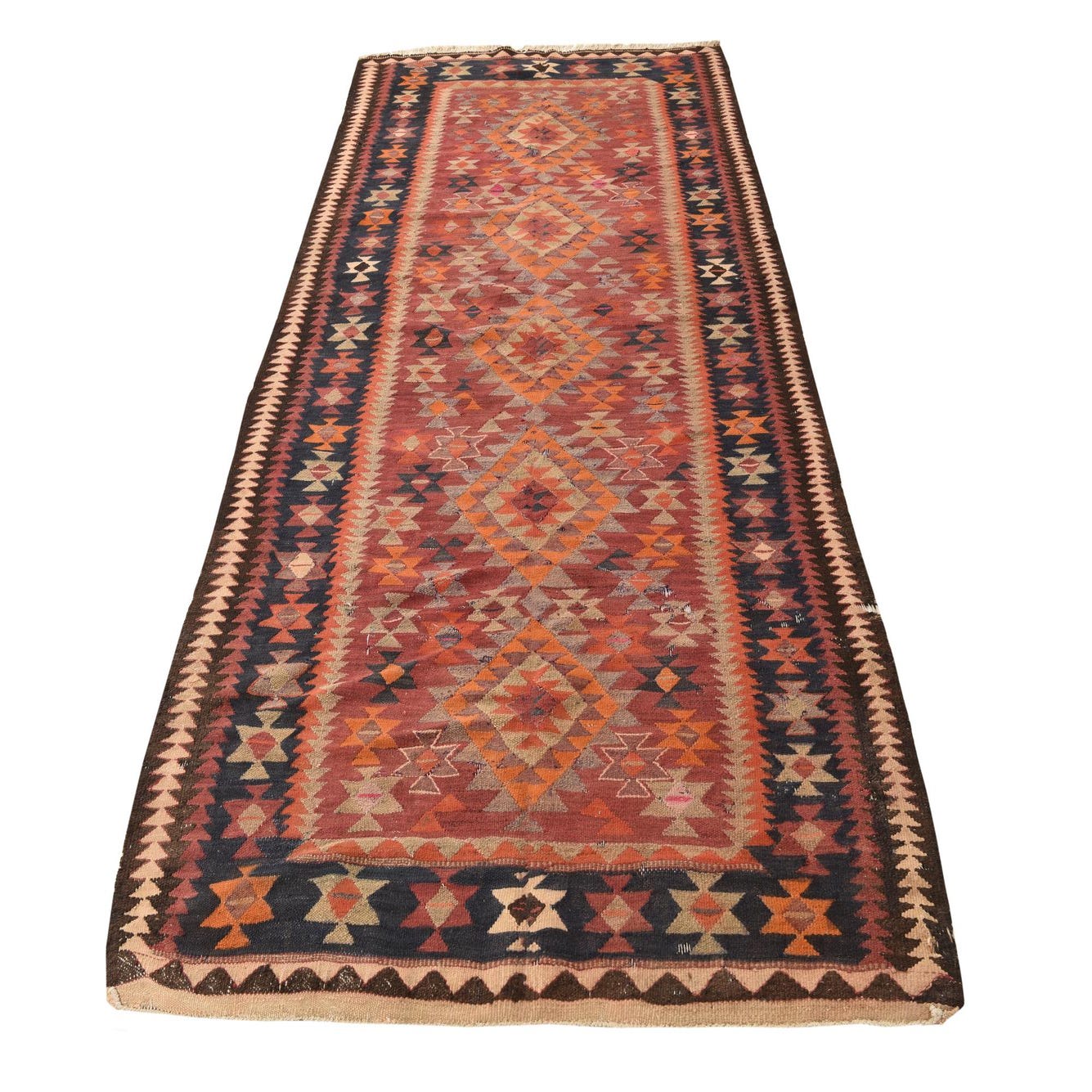 A 9 ft runner rug with a flatweave texture, featuring a vibrant Southwestern-inspired geometric pattern in oranges, reds, and dark blue, ideal for a hallway.