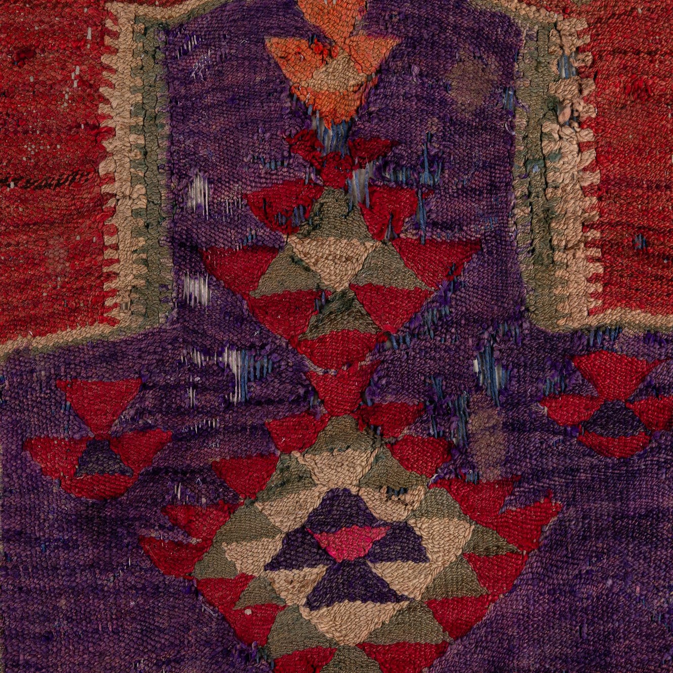 A 9 ft runner rug with a vibrant tribal pattern in oranges, reds, and deep purple, ideal for a hallway.