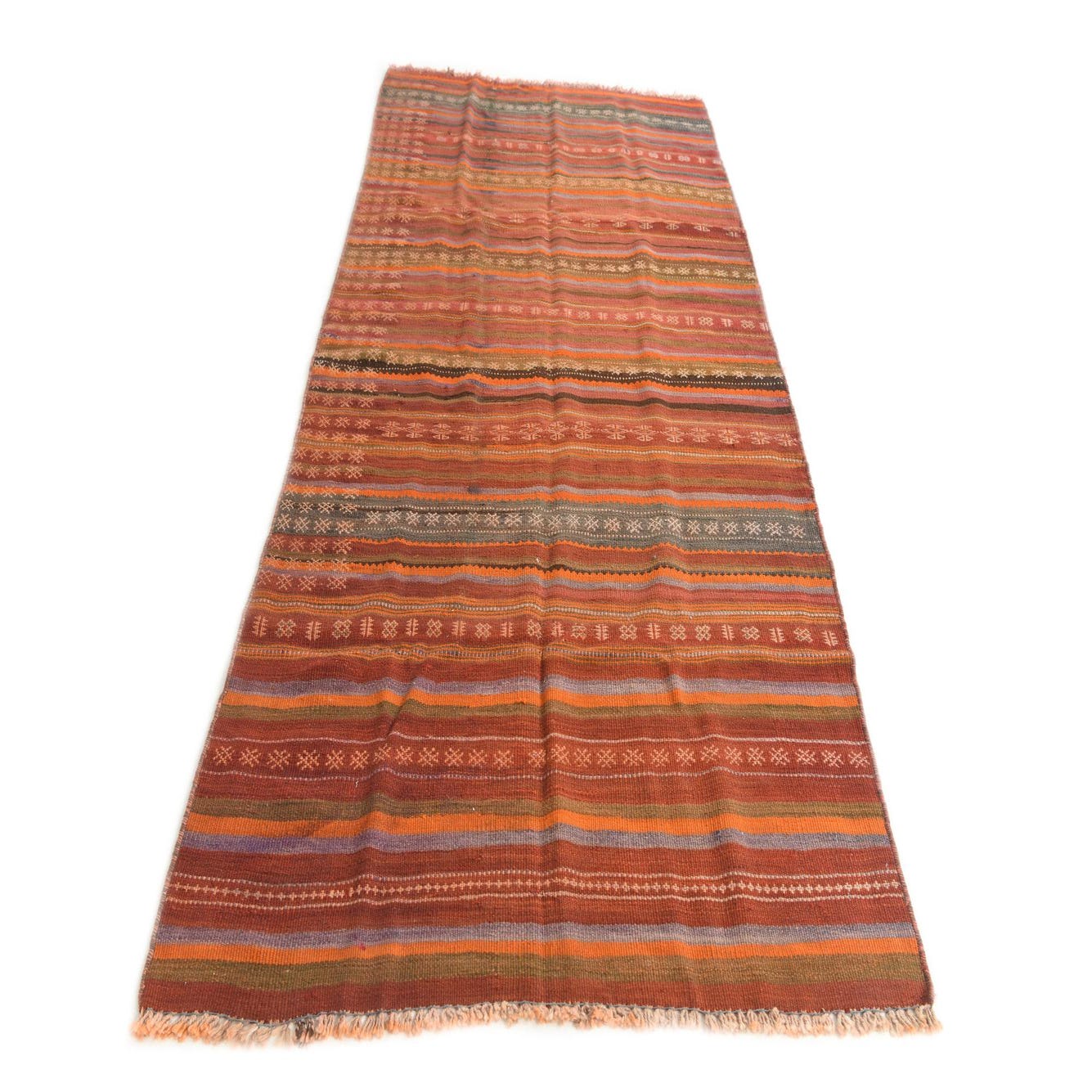 A 9 ft Kilim Modern runner rug in oranges and reds, featuring a flatweave tribal pattern with fringe.