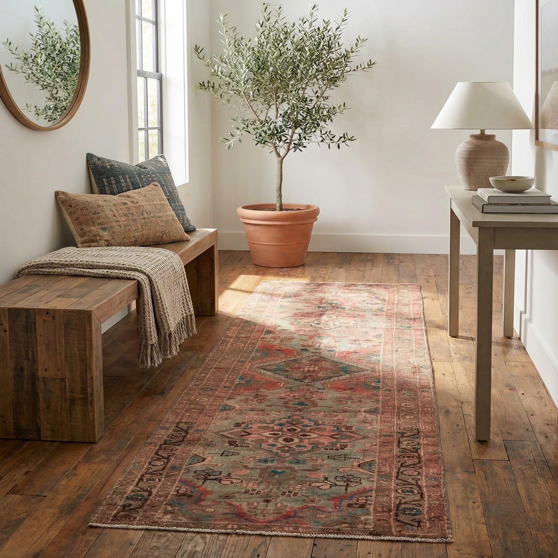 A 9 ft runner rug with a faded Persian medallion pattern in shades of orange, red, and muted teal, ideal for a hallway.