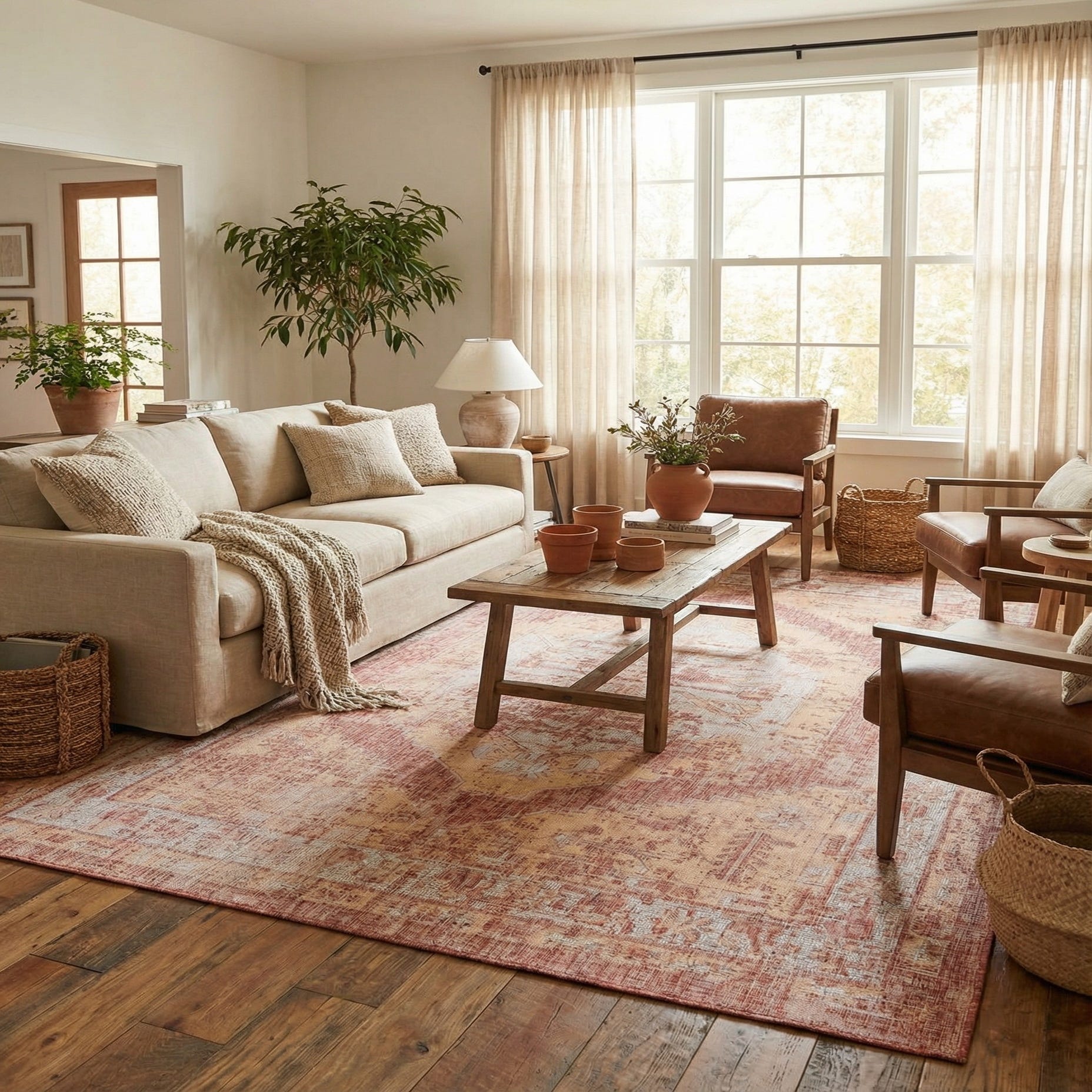 Machine-made from 100% polypropylene, this rug offers easy placement in both indoor and covered outdoor settings. It pairs naturally with warm wood furniture and neutral linen upholstery, and complements styles ranging from farmhouse and southwestern to coastal boho. Use it to ground a living room seating area, anchor a dining table, or add layered warmth to a screened porch with rattan and iron accents.
